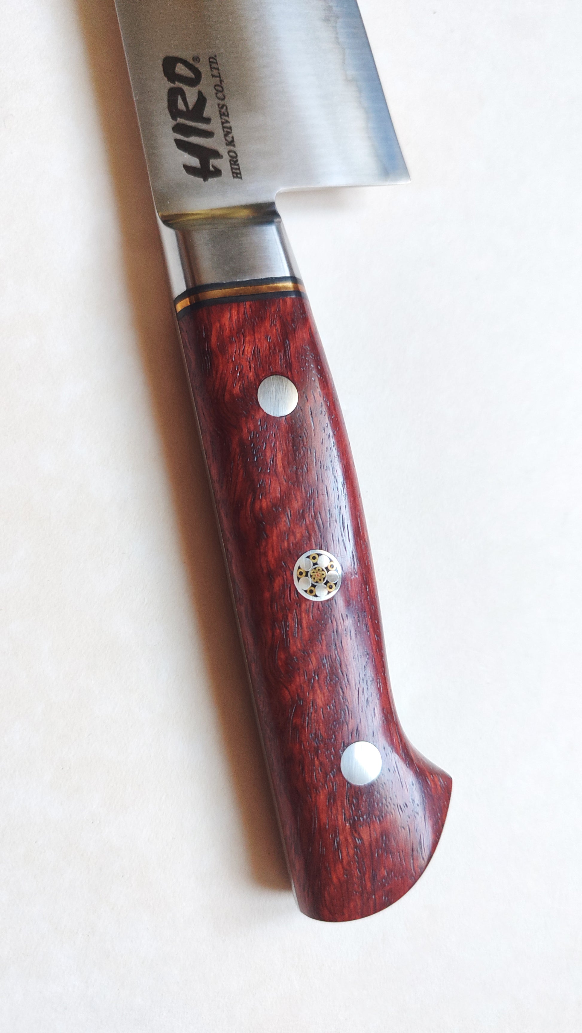 Le coeur de la lame en acier blue paper steel (aogami) c'est un acier qui contient du Tungsten et qui garde une excellente longévité de tranchant. Le manche est de forme occidental façonné dans un morceau de Cognassier du Japon. Il comporte un insert en laiton et un rivet à motif multi-métaux.