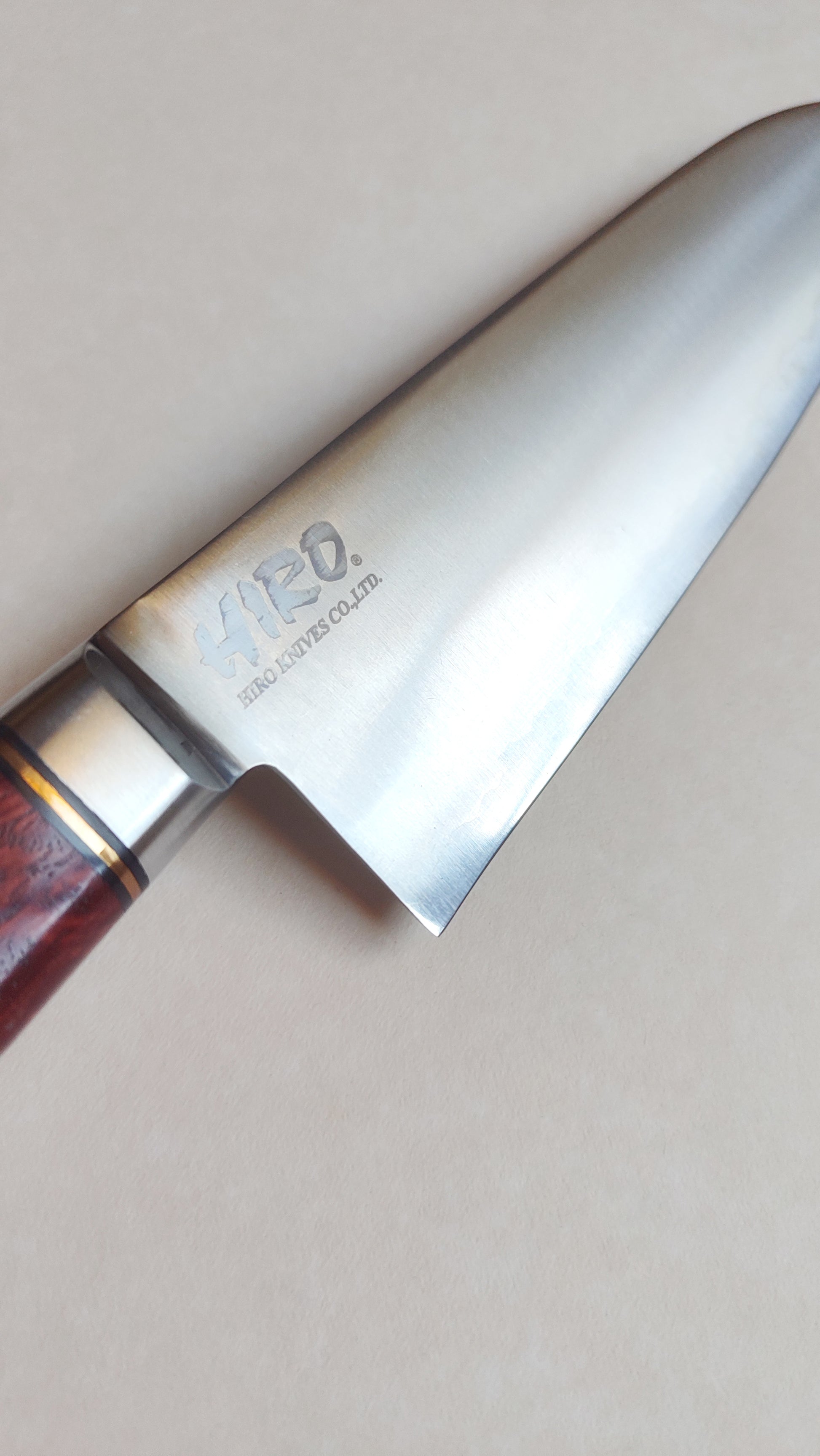 Ce magnifique couteau japonais "Santoku" fait 180mm de long (partie coupante). Son épaisseur est de 2mm au niveau du milieu de la lame. Il arbore une jolie finition martelée polis. Il est fabriqué par le vénérable "Hiro Masui" (80ans) dans la ville de Seki.
