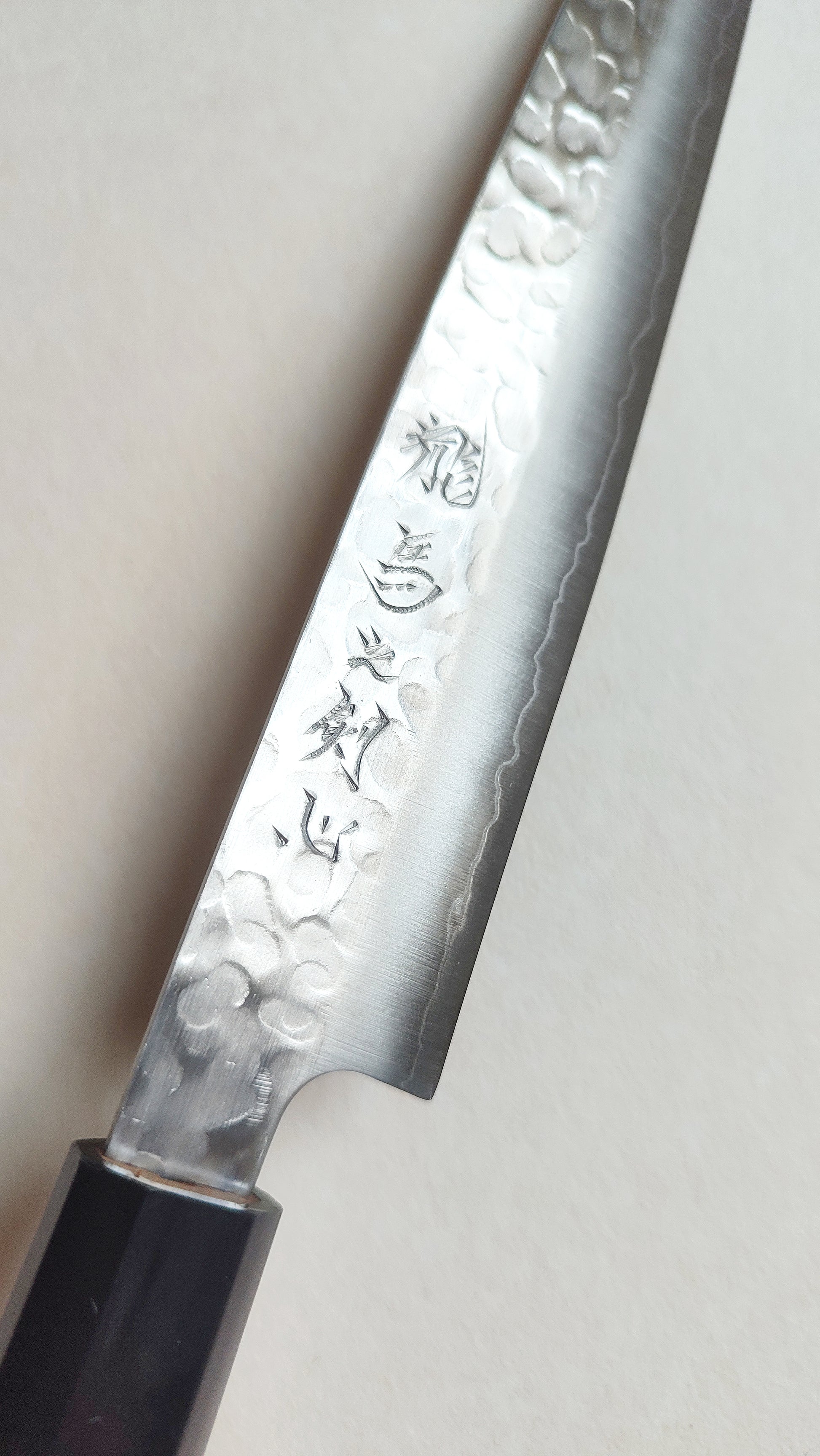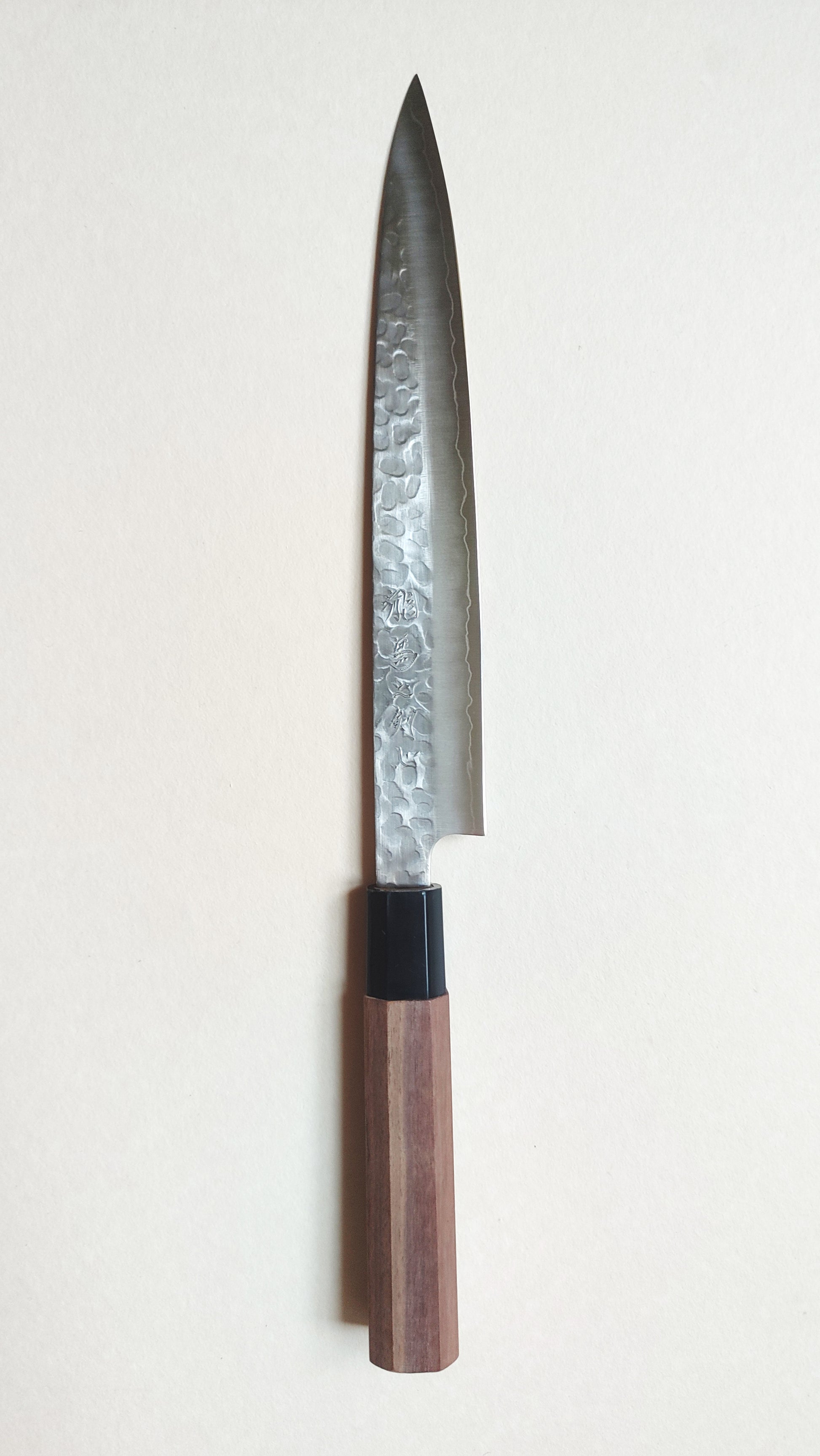 C'est un couteau en acier bleu hautement carboné bi-couche. Le manche est de forme octogonale. Il est en palissandre et la mitre (bague en haut du manche) en corne. C'est un couteau fin pour découper finement les chairs. Ce yanagiba est à double biseaux.