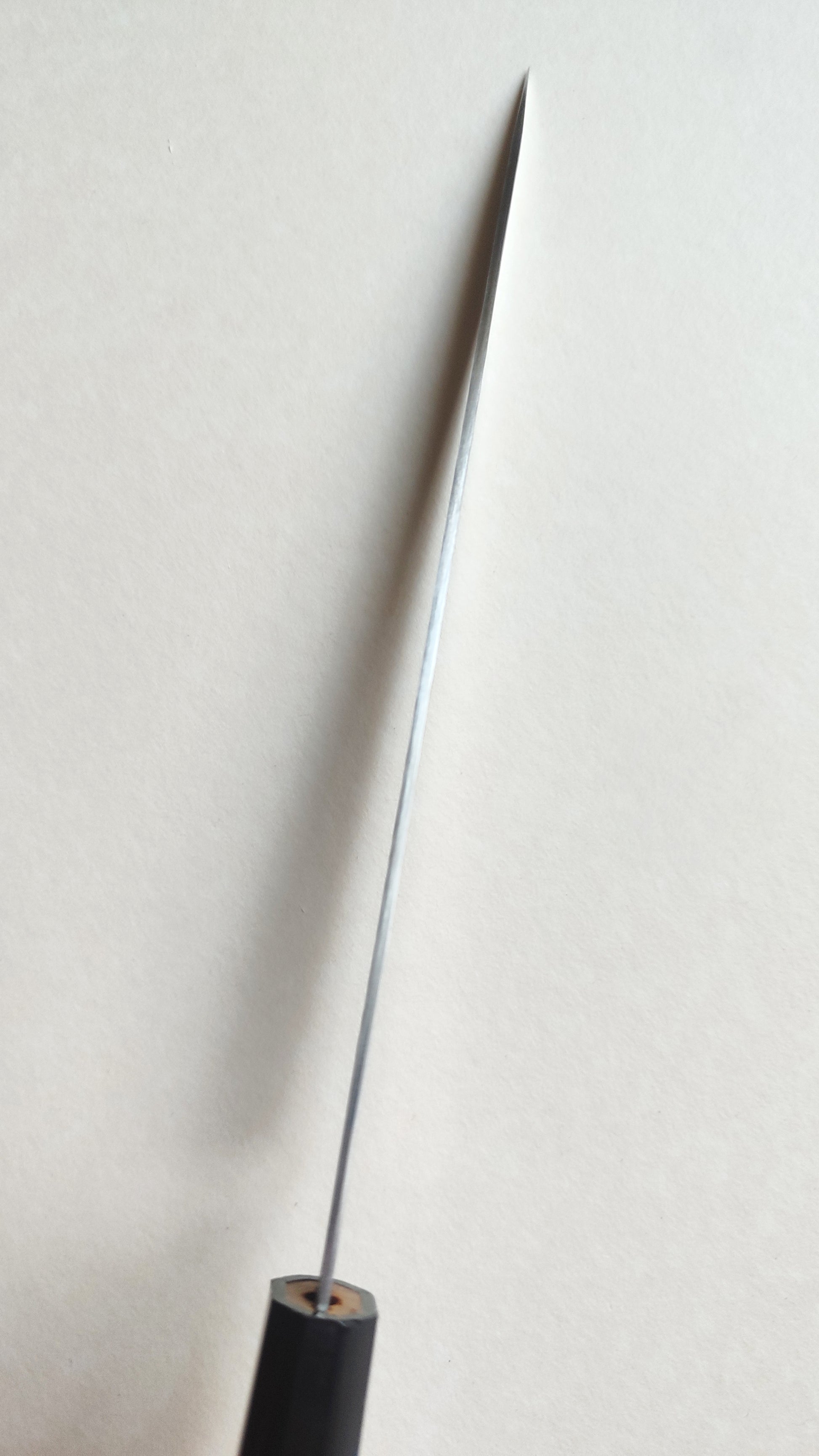 Ce long couteau japonais "Yanagi-ba" de 200mm de long (longueur du tranchant). Son épaisseur est de 1,8mm en milieu de lame. C'est un couteau de la marque "Tosa Uchi"