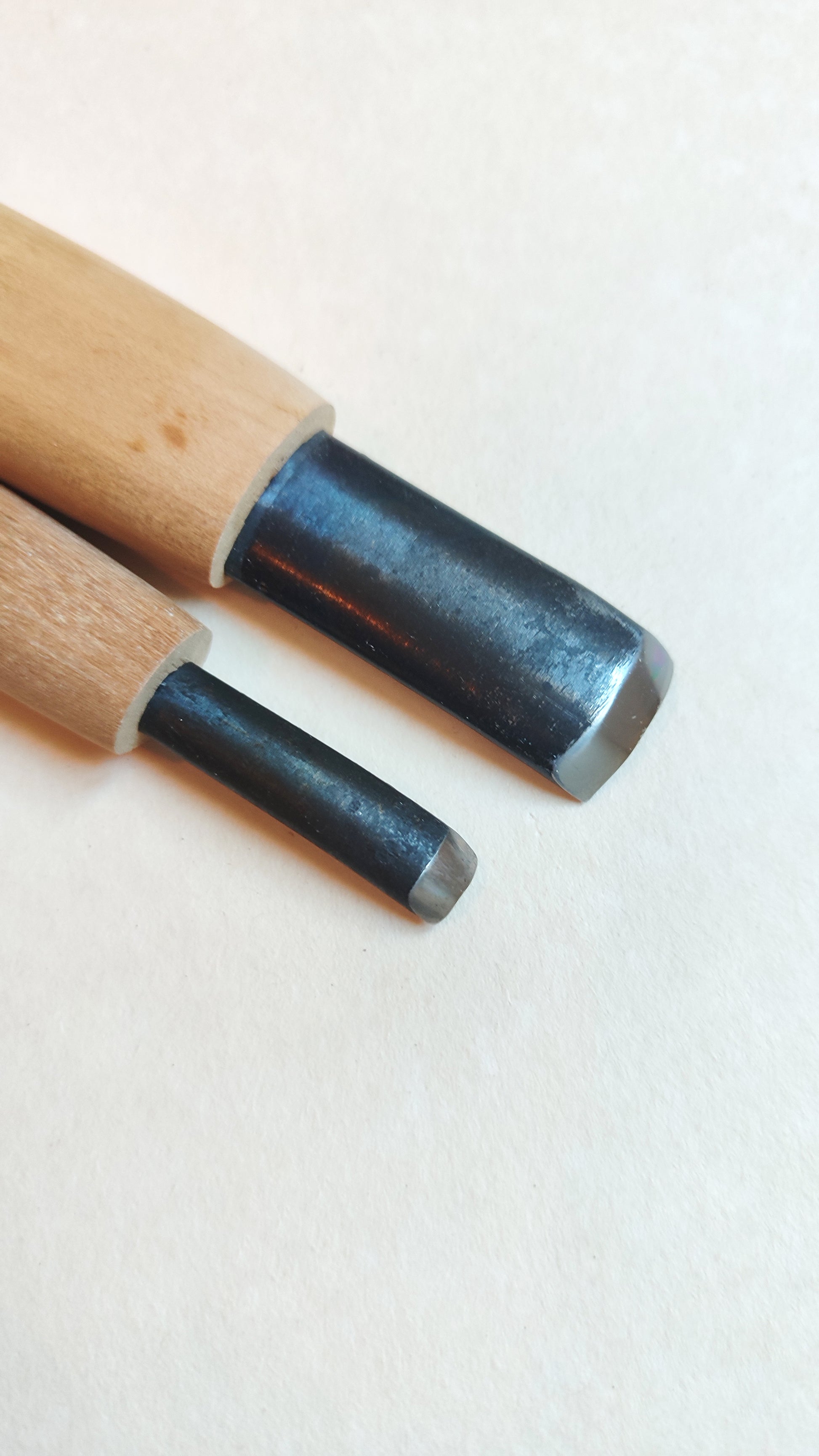 Cette paire de gouges japonaises pour la gravure sur bois se compose d'un 7,5mm et d'un 18mm de large. Ces gouges sont appelées chokokuto. Ces chokokuto ont une lame forgée insérée dans un manche en bois. )...