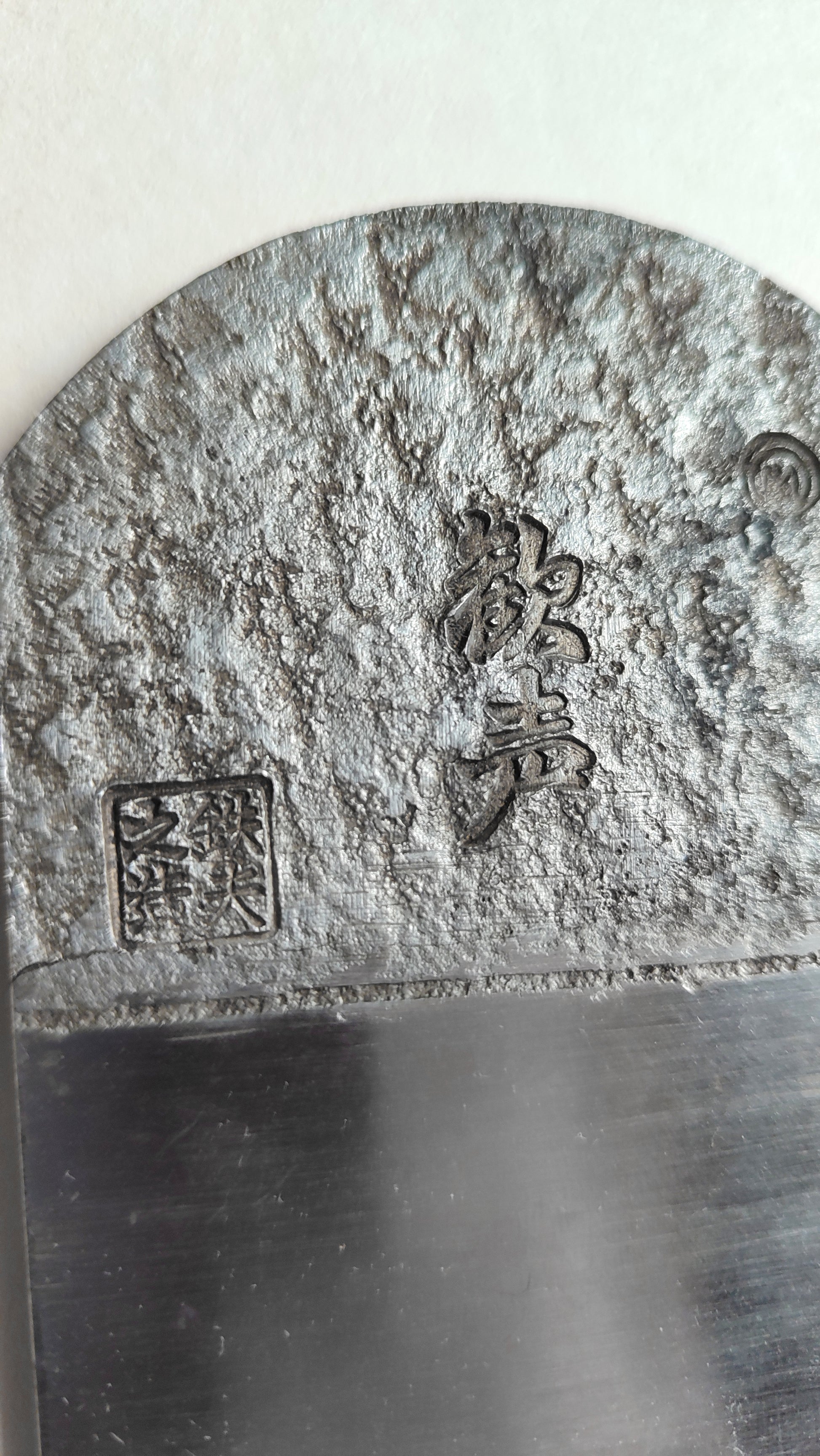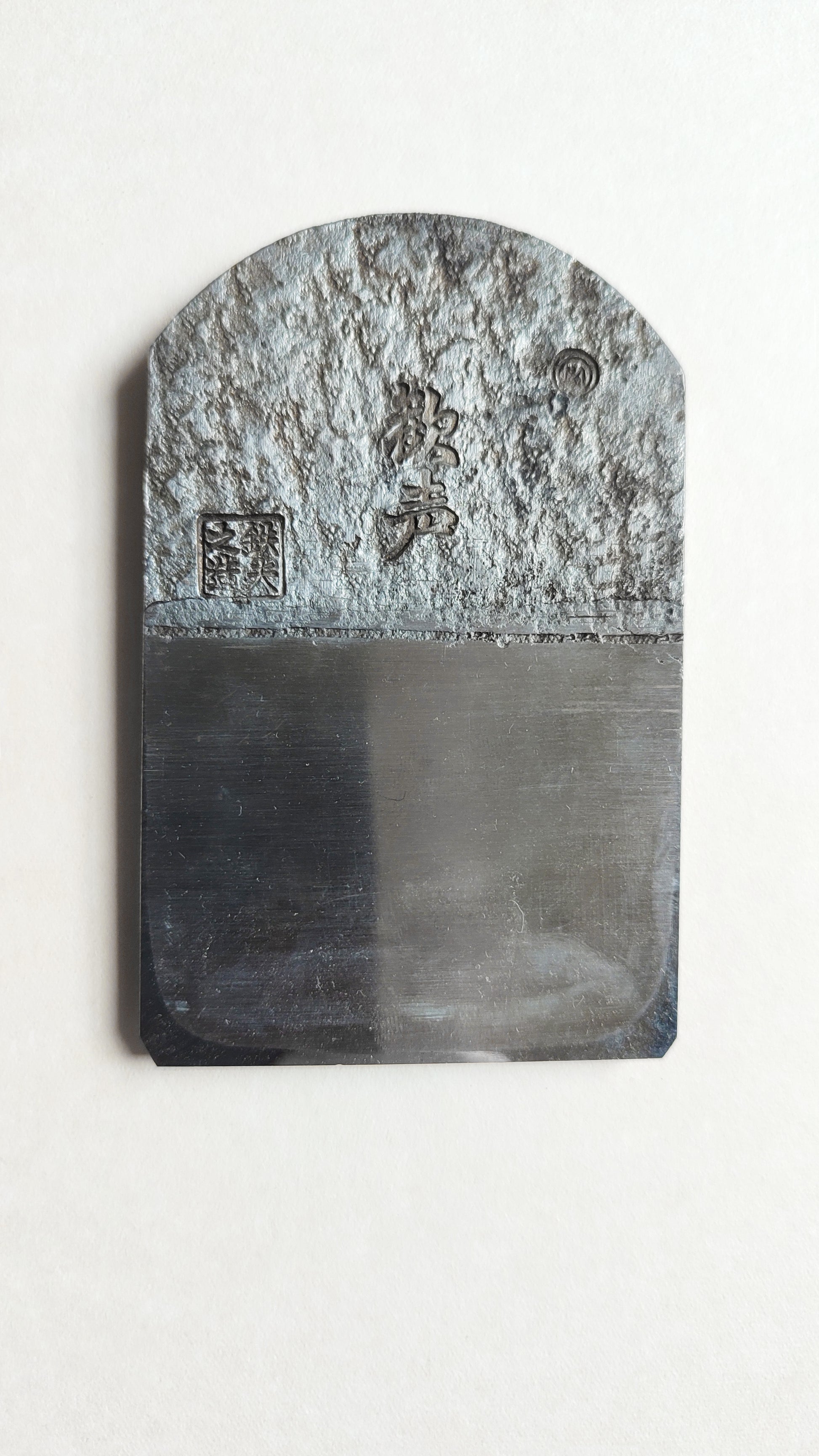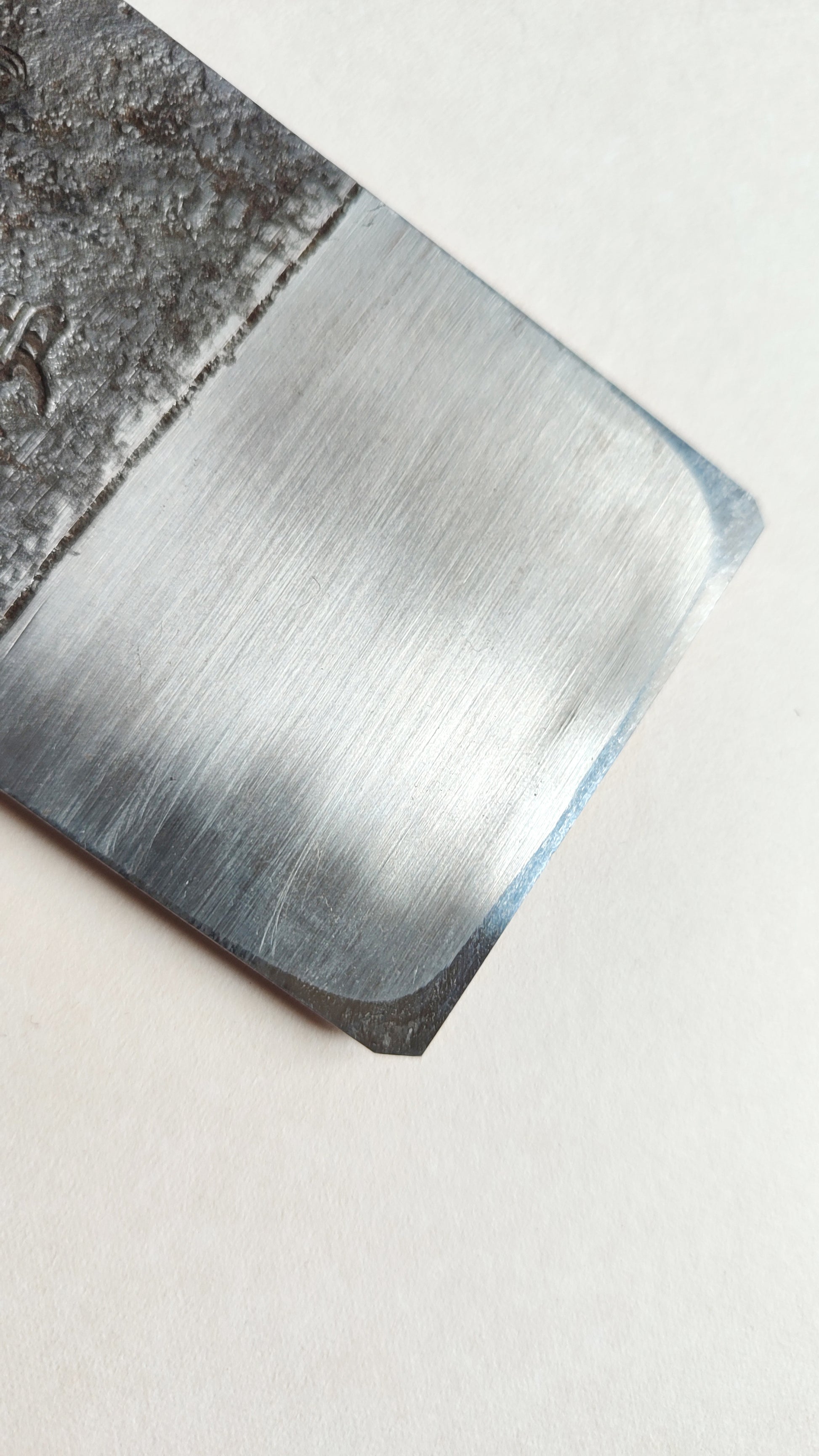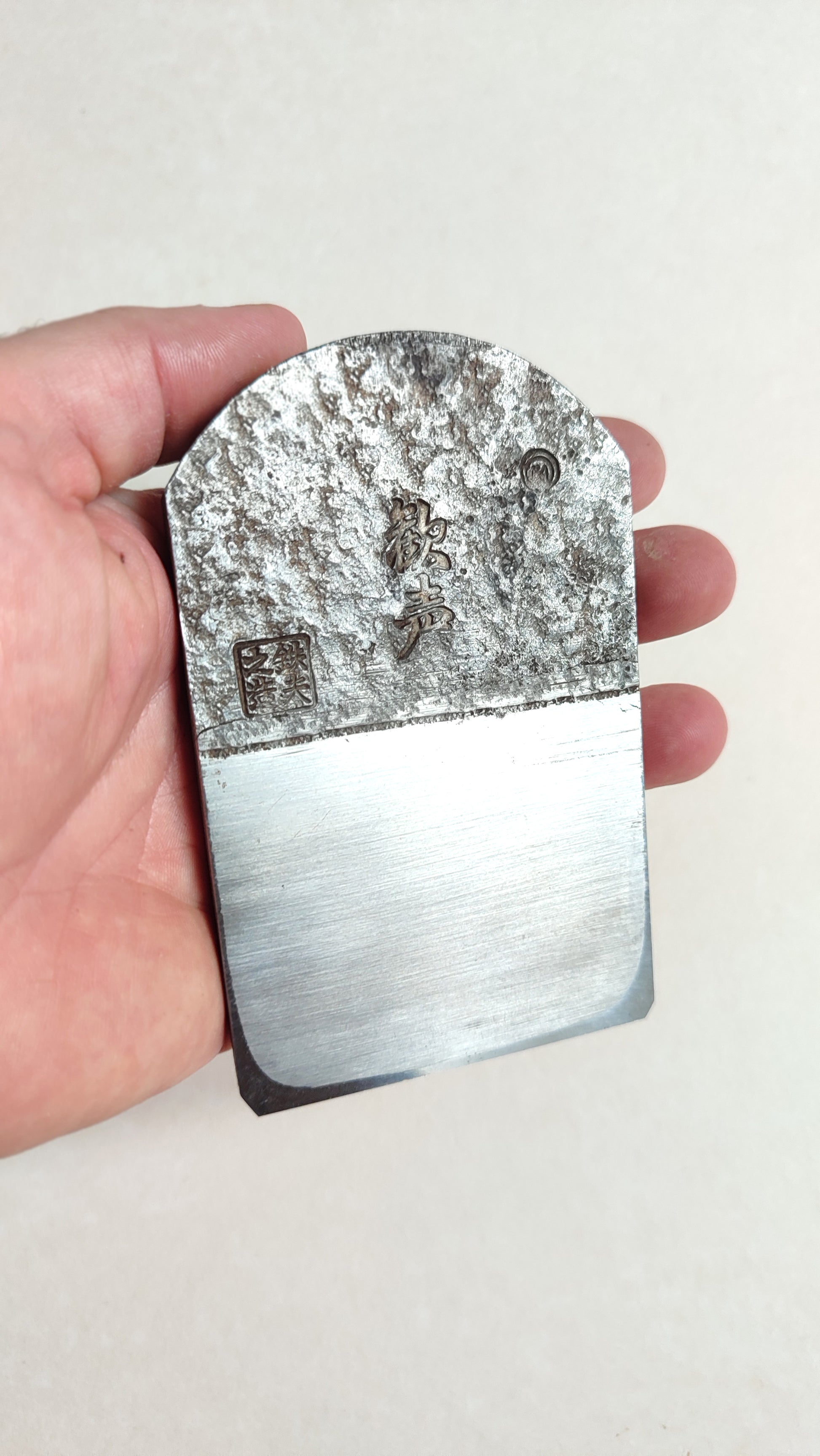 Le fer est en acier spécial hautement carboné bi-couche forgé main. Le "Jigane"(acier support) est en "Kamaji". C'est un acier de fonte ancien (encre ou chaîne de bateau, éléments de pont). Ce type d'acier est trés recherché par les forgerons japonais pour sa malléabilité et également apprécié pour ses qualités à l'affûtage. L'Ura est particulièrement fine et régulière. Elle est trés belle et bien harmonieuse. Il a un laminage qui tend à disparaître car il est plus compliqué à forger. On peut le voir sur le côté du fer, il y a un repli du "Hagane" (acier dur) en haut du laminage. Cela permet d'avoir toujours un maximum d'acier dur en fin d'utilisation. Il a ces poinçons profond typique de cette période.