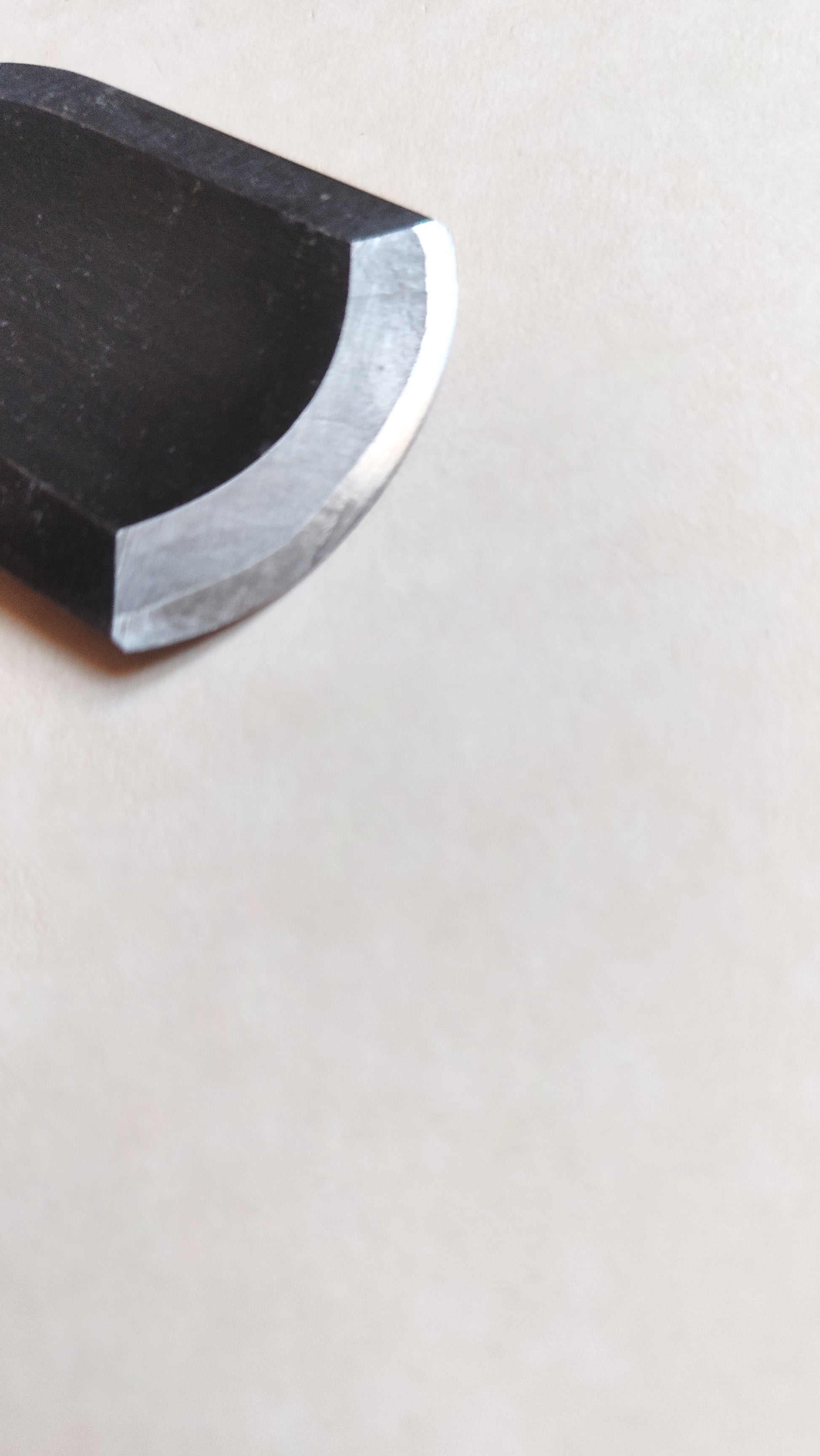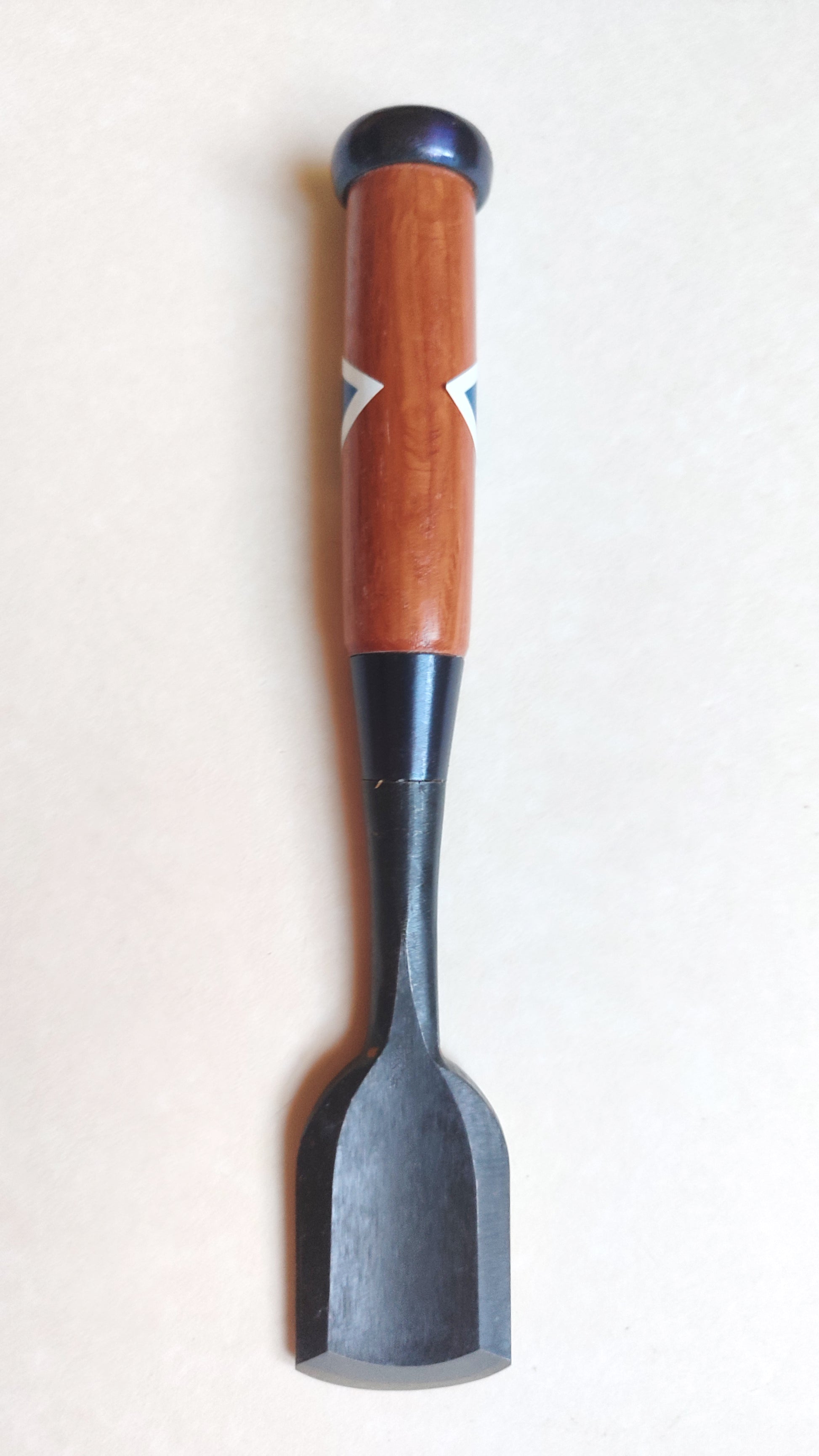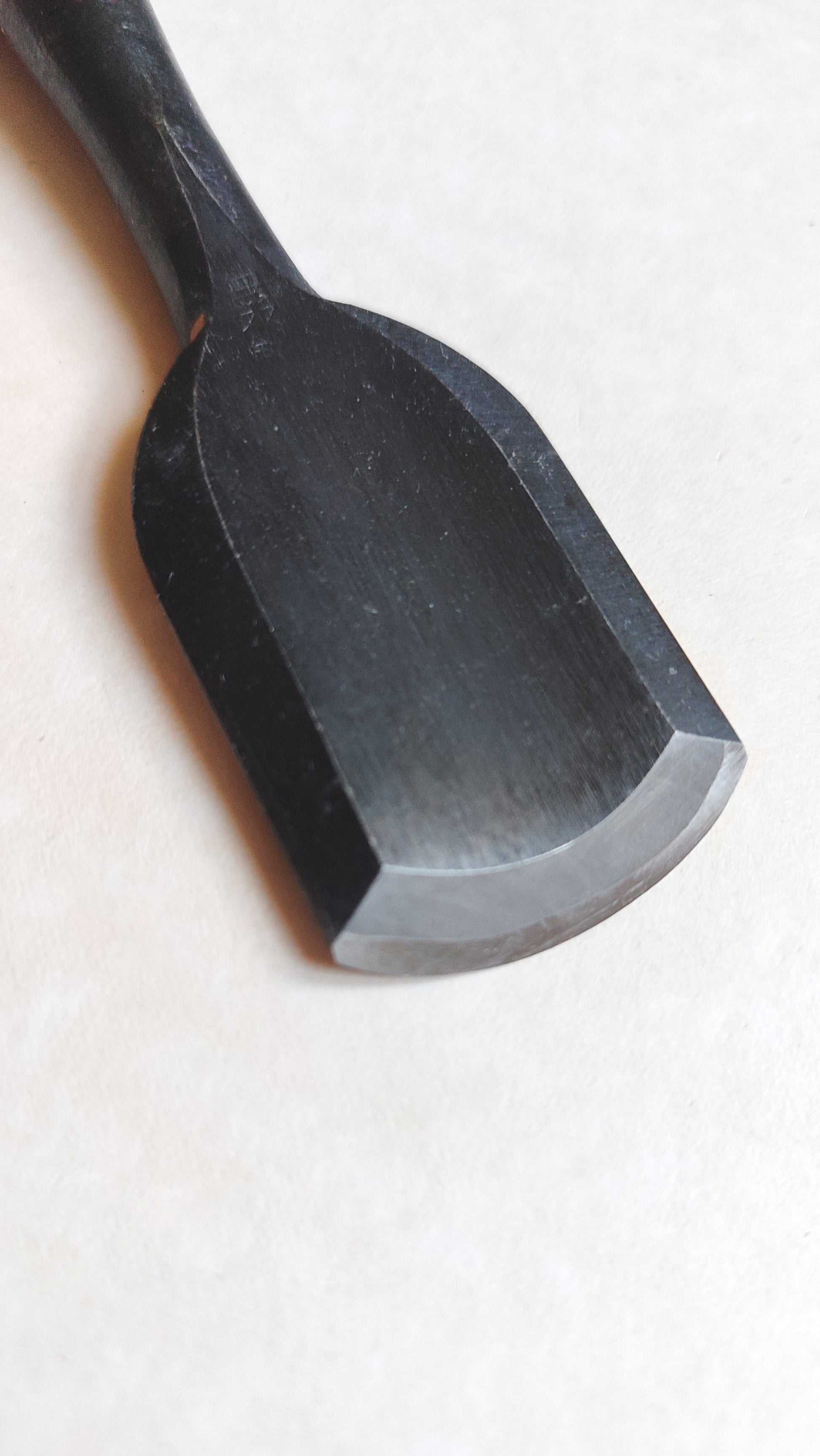 Ce ciseau "Sotomaru Nomi" fait 220mm de long. Il est adapté à la réalisation de travail de sculpture avec des moulurages sur du mobilier ou des éléments de décor de charpente. Comme tous les ciseaux neuf, un affutage est à prévoir, ainsi que le réglage de la virole. Oui généralement les fabricants affutent grossièrement leurs production pour gagner du temps. Au Japon c'est toujours à l'acquéreur de l'outil de finaliser et d'adapter l'outil à son propre usage, c'est une philosophie de l'outil...