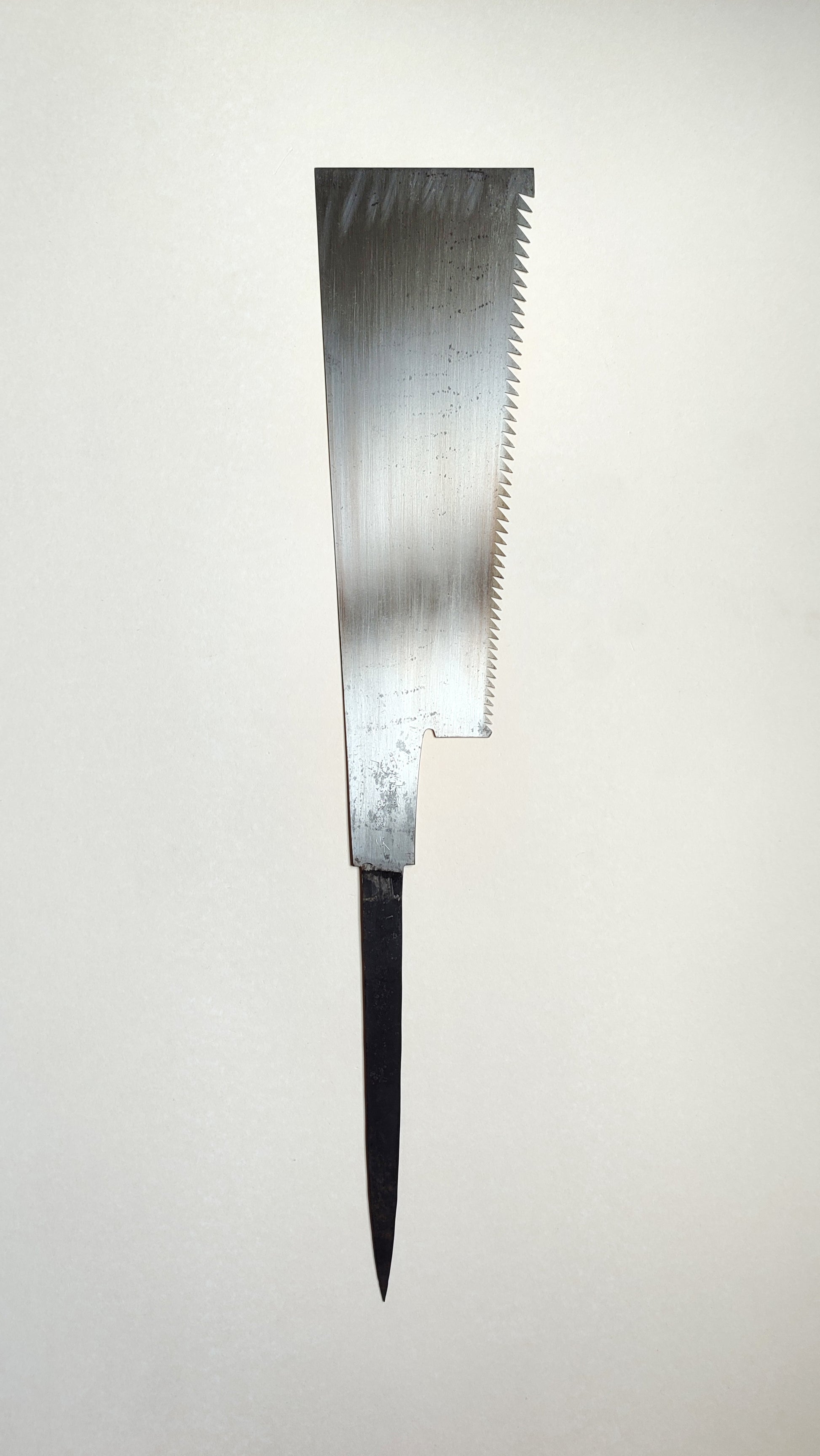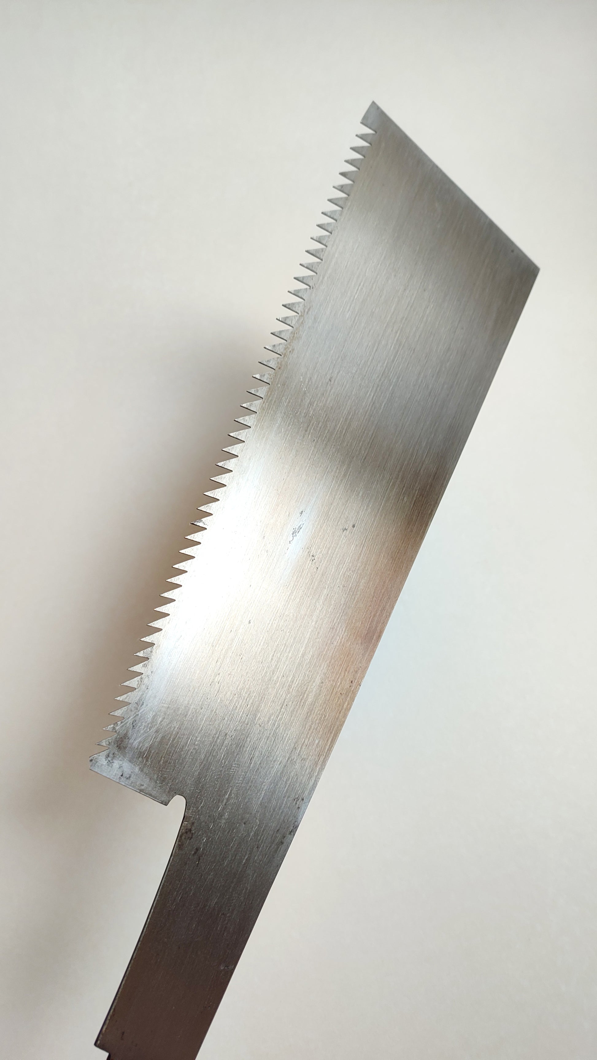 Cette scie forgée main vintage est directement importée du Japon. Il y a la signature gravé de forgeron inconnu. Sa longueur de lame est de 350mm (zone de coupe), la longueur totale est de 700mm, la profondeur de coupe au milieu de la lame est d'environ 110mm. Il faut imaginer qu'une fois le manche montée (400mm), elle fera environ 830mm de long. Elle est neuve et en trés bon état. Elle est de qualité A*.