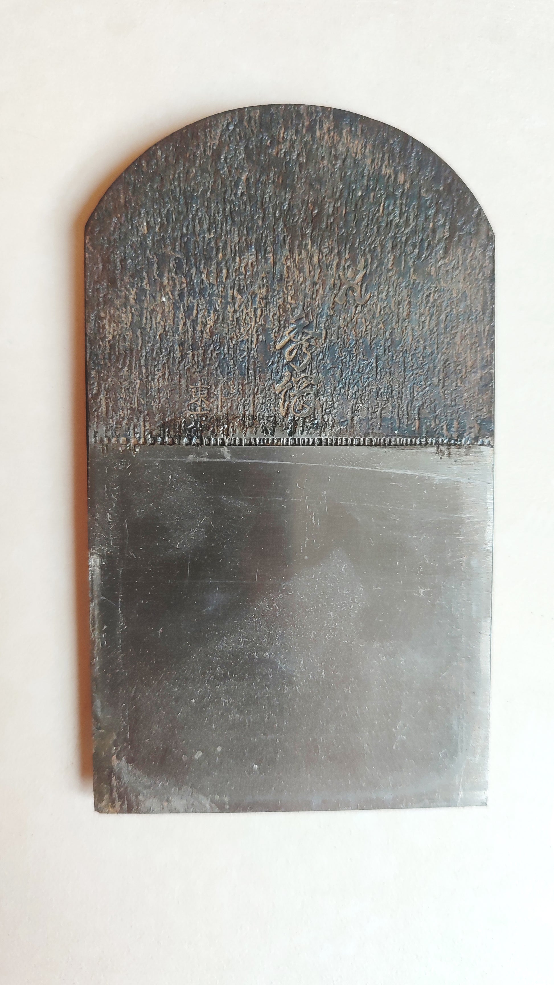 Le fer est en acier très carboné bi-couche forgé main. Le fer est marqué avec un joli motif martelé. Le contre fer est épais et laminé .