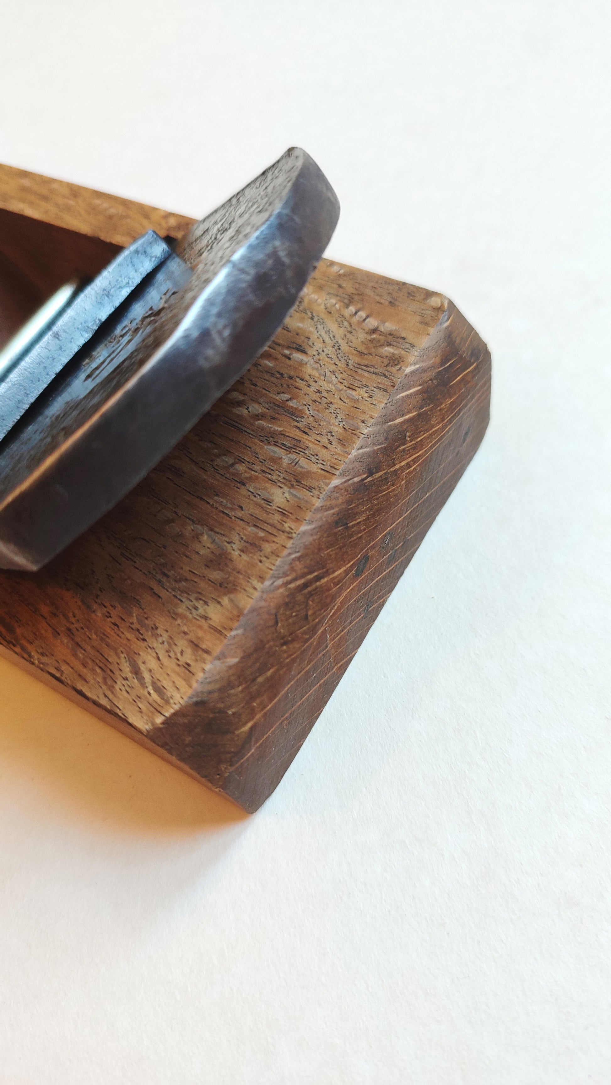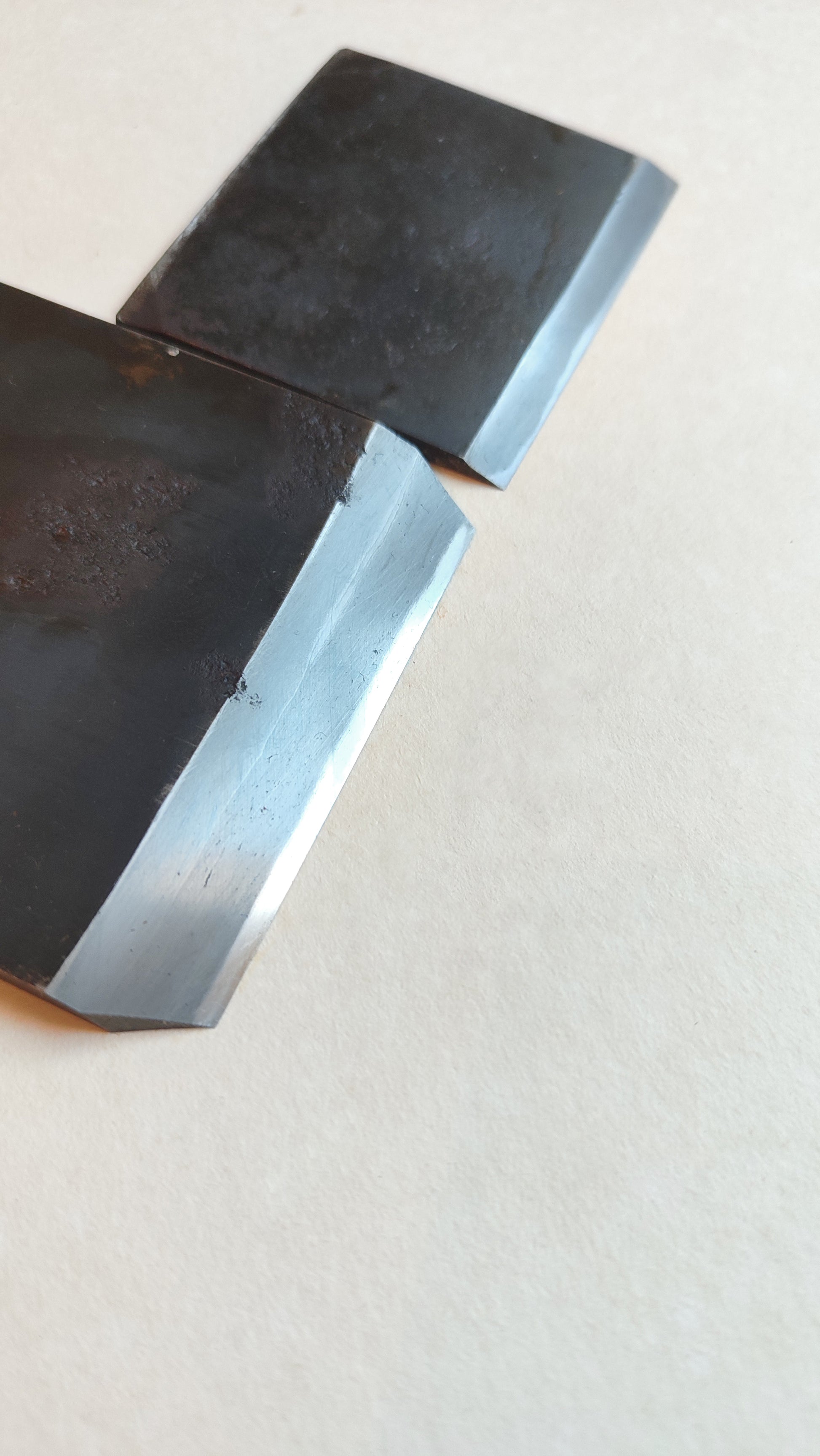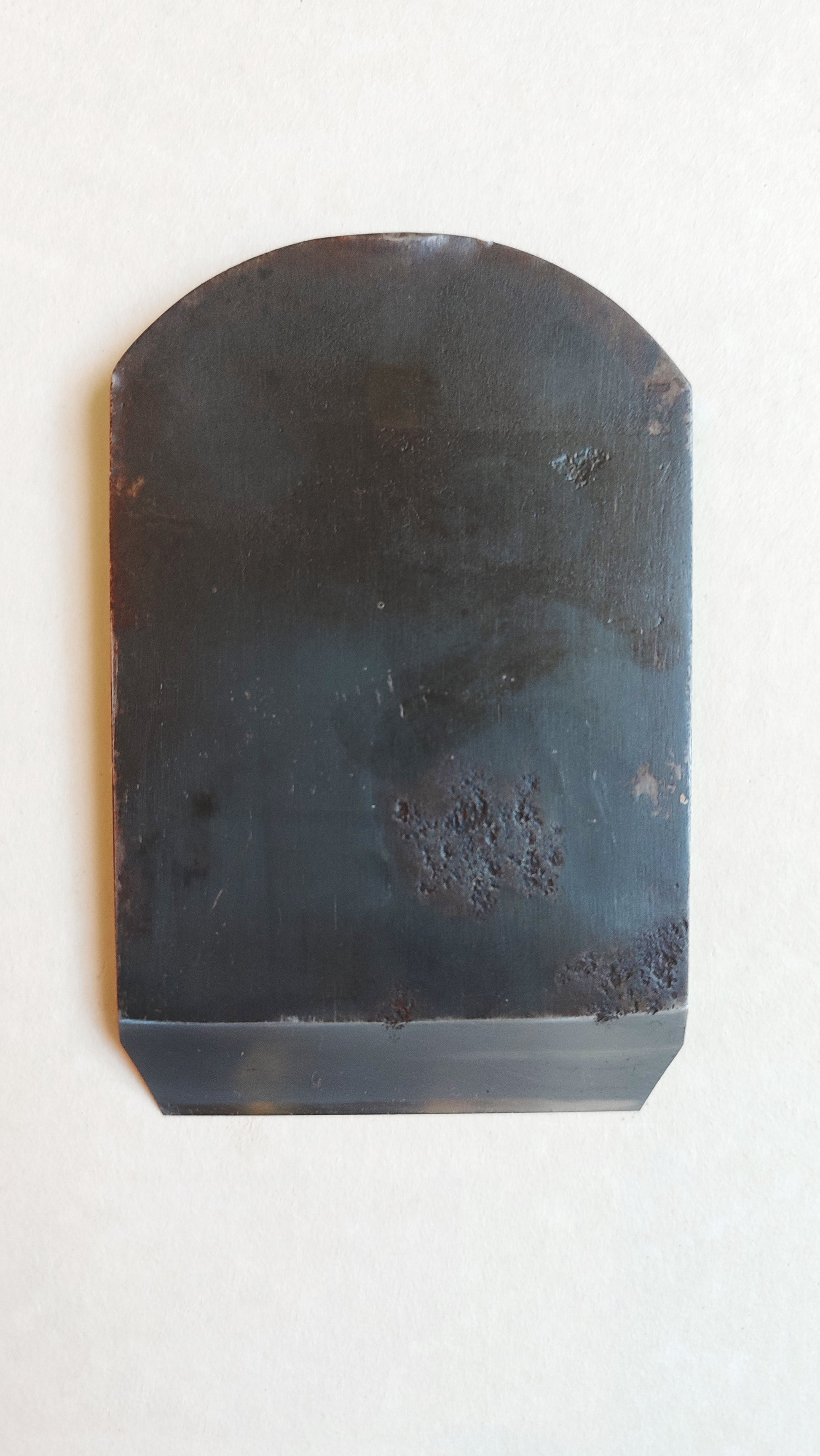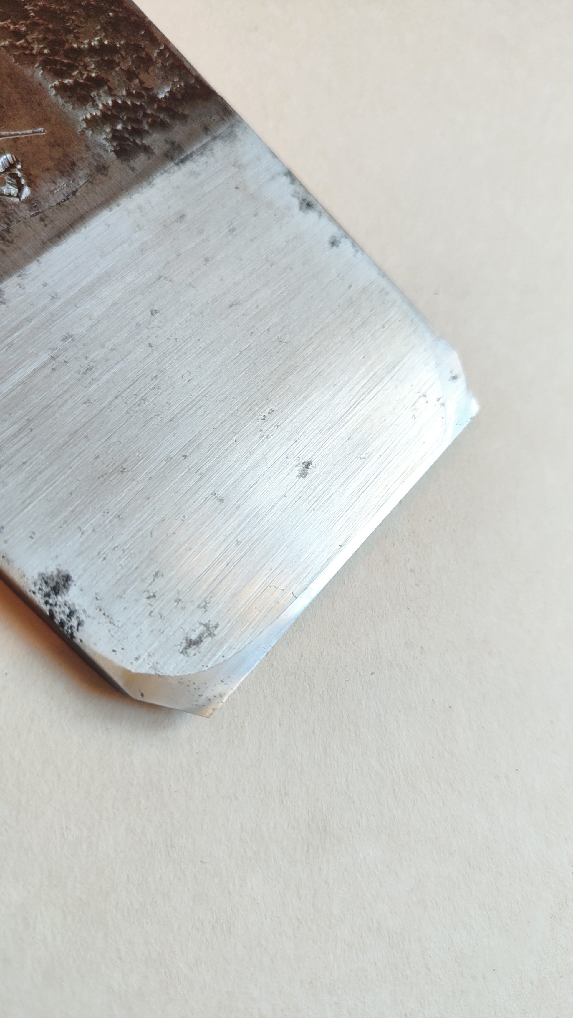 Le fer est en acier très carboné bi-couche forgé main. Le fer a une belle finition polie sur le sortie de forge. Le contre fer est épais et il est laminé. Il est de trés bonne qualité, il est également signé. Le fer principal comporte quelques piqûres de rouilles sur le jigane (acier doux/support) qui ont été traitées et qui dégrade en rien la qualité du fer.