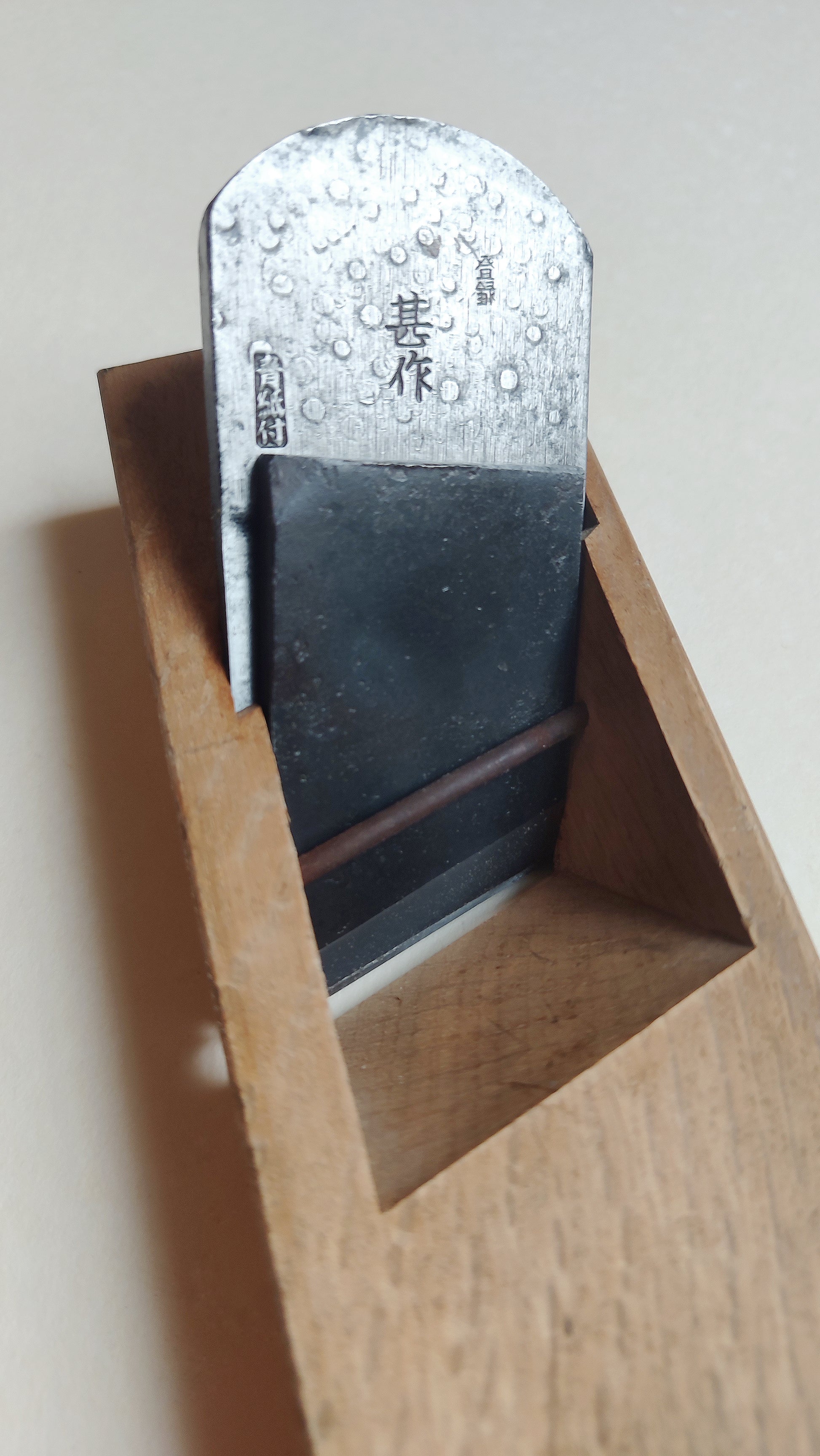 Cet outil est vraiment facile d'utilisation et permet de finir des assemblages très rapidement. Le fer est en acier forgé carboné bi-couche (blue paper). Le tranchant fonctionne très bien, je l'ai affuté à la pierre à eau jusqu'au grain 6000. Le Daï (bloc de bois) est en parfait état.