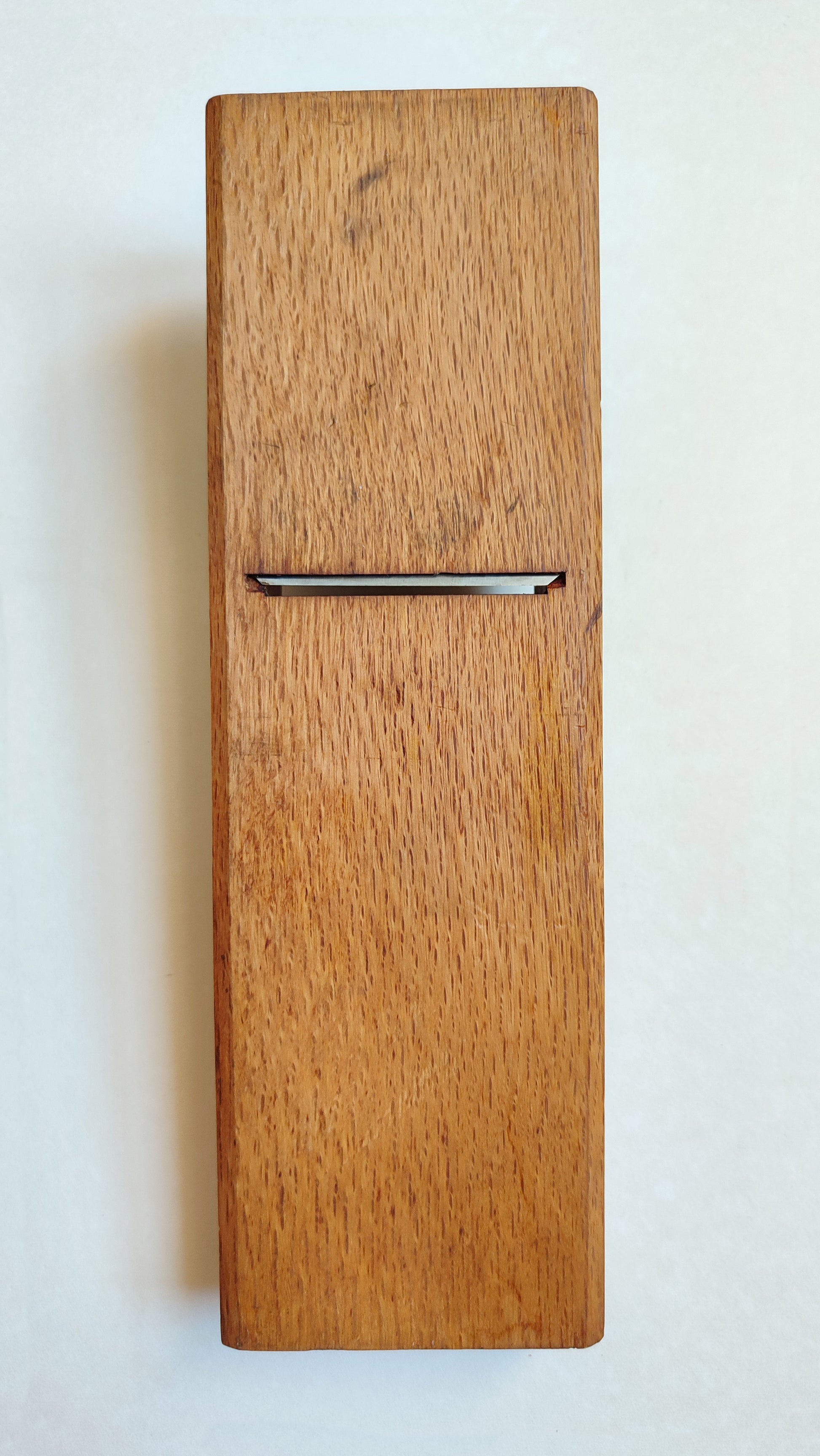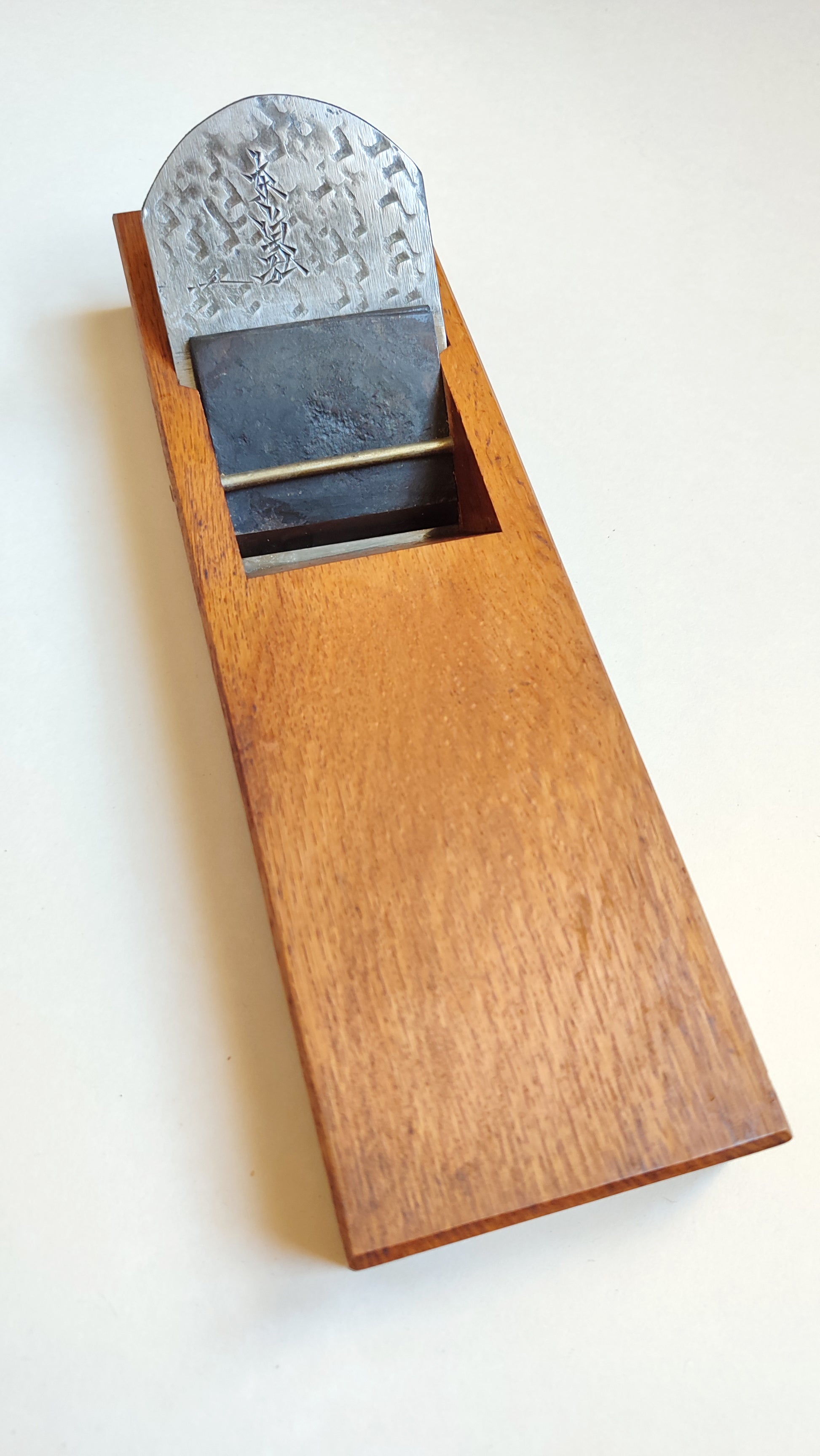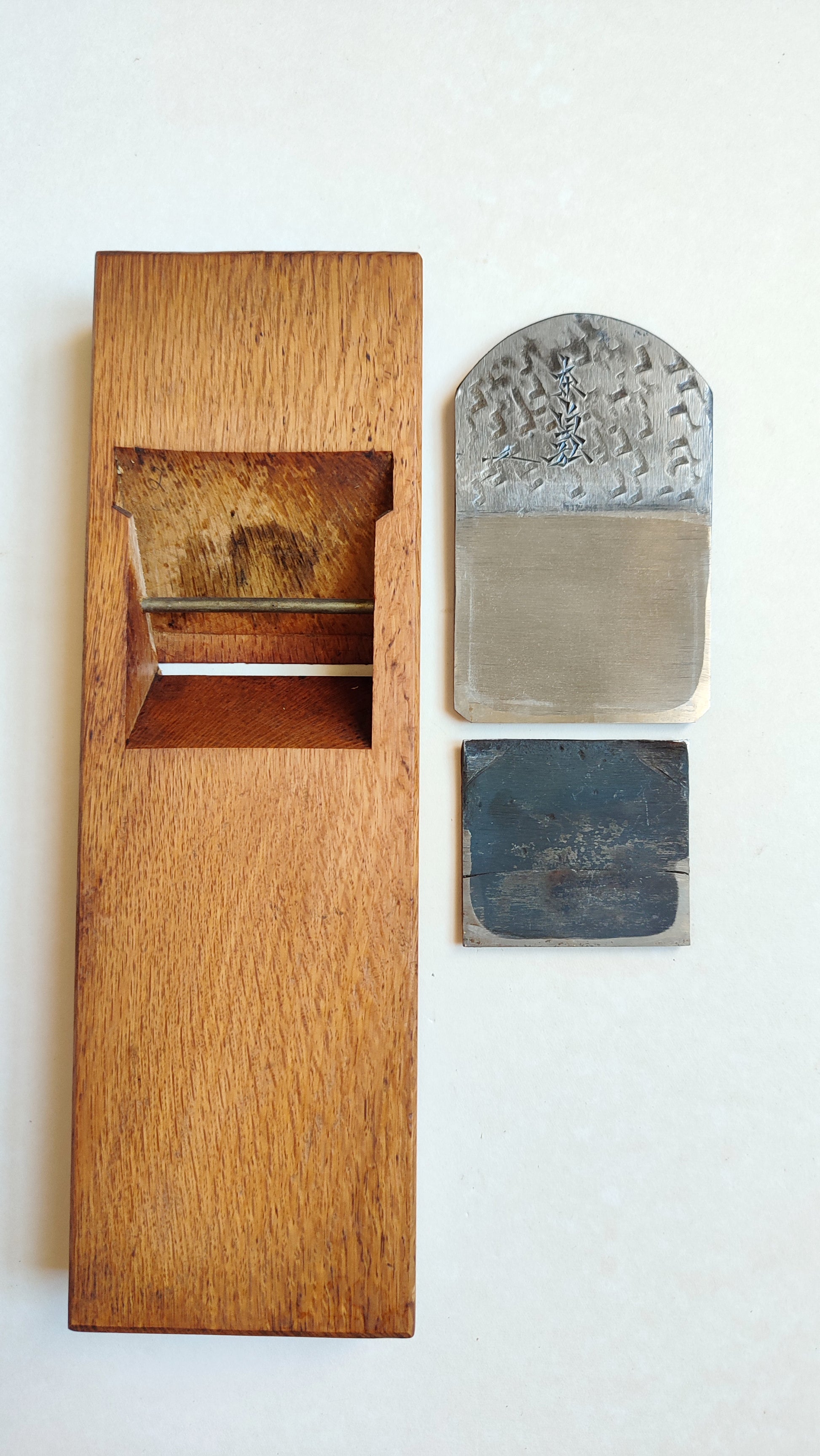 Le fer est en acier carboné bi-couche forgé main. Impossible de dire de quel type d'acier il s'agit au vu la période.Le tranchant fonctionne bien. L'Ura (arrière du fer) est très bien exécuté, je l'ai personnellement affûté. Le contre-fer est épais et également laminé. Le biseau nécessitera un affûtage plus rigoureux pour obtenir toute la largeur de coupe. Le contre fer n'est pas parfait mais je l'ai déjà bien restauré pour que l'ensemble soit de nouveau sur de bon rail.