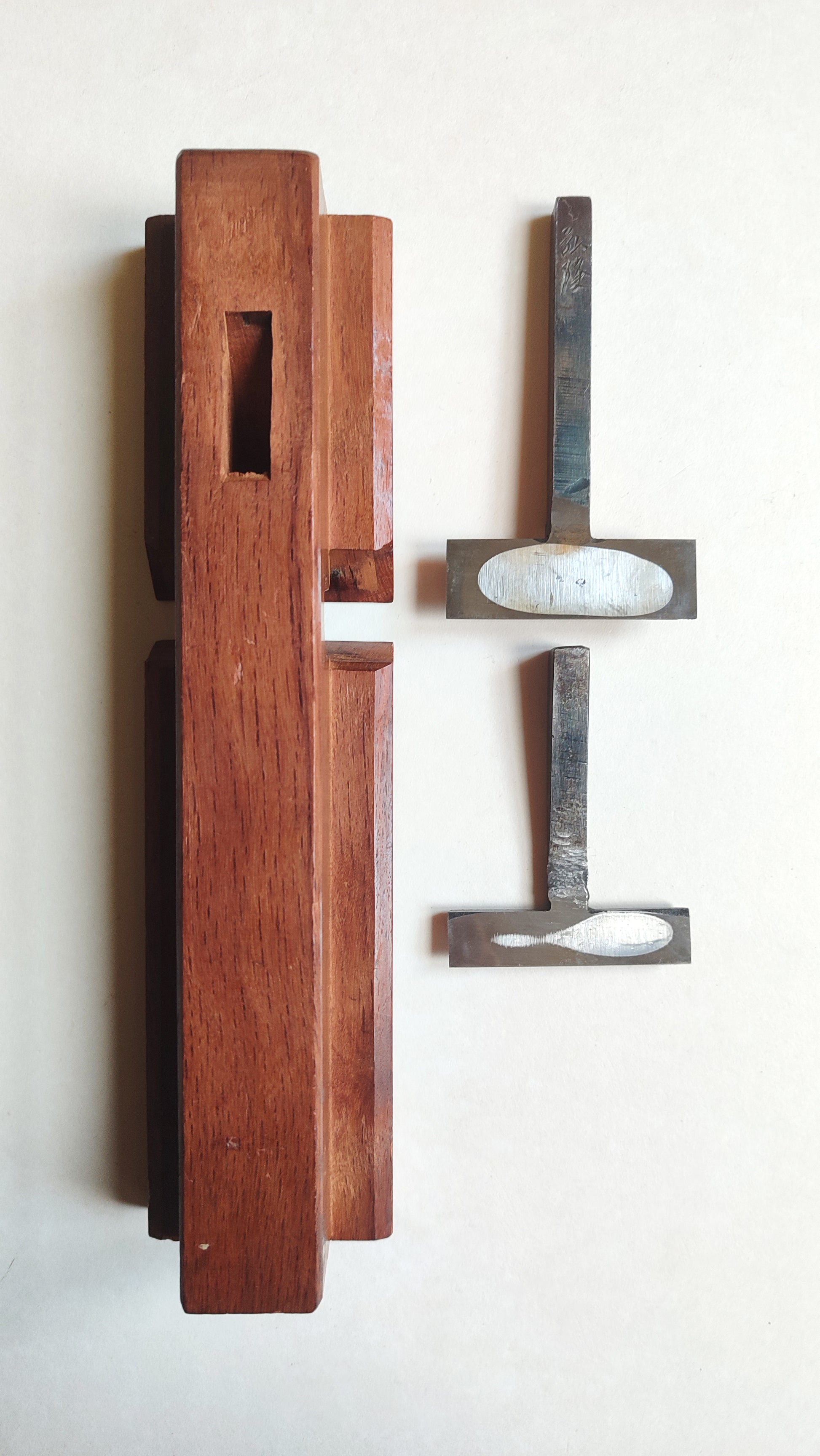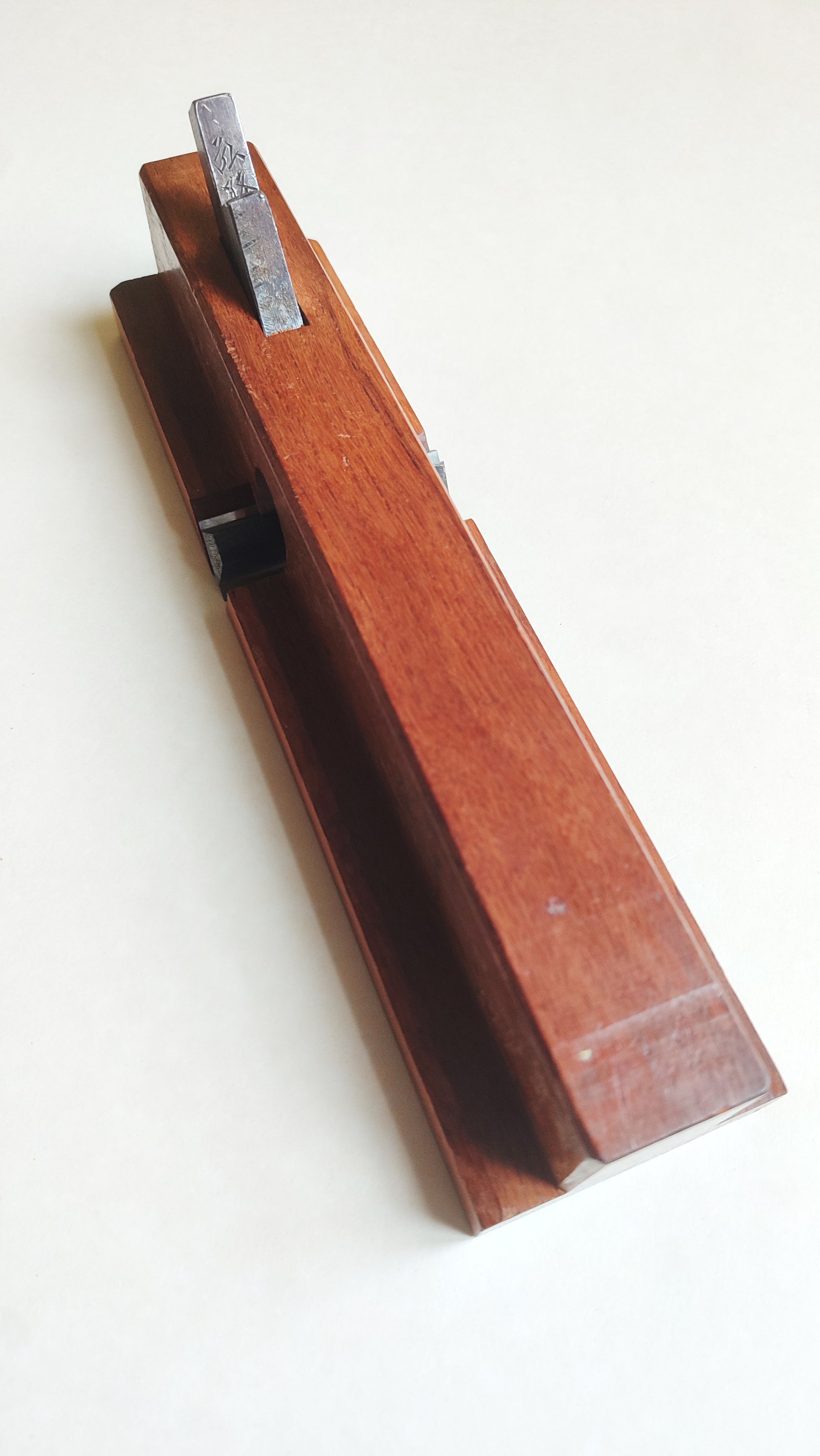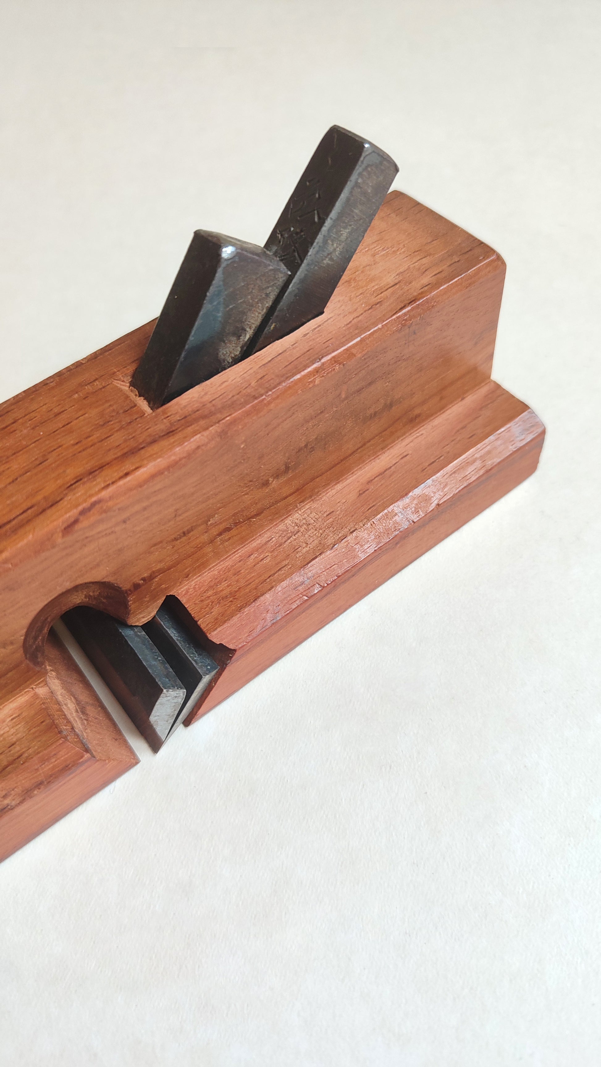 Le Daï, bloc en chêne rouge du japon est massif et en parfait état, la semelle est bien lisse, elle est bien droite. Le Daï mesure: longueur 258mm, largeur 65mm, hauteur 47mm (max) et 18mm (min). Le fer est en acier très carboné bi-couche forgé main. Le contre fer est épais et il est laminé.