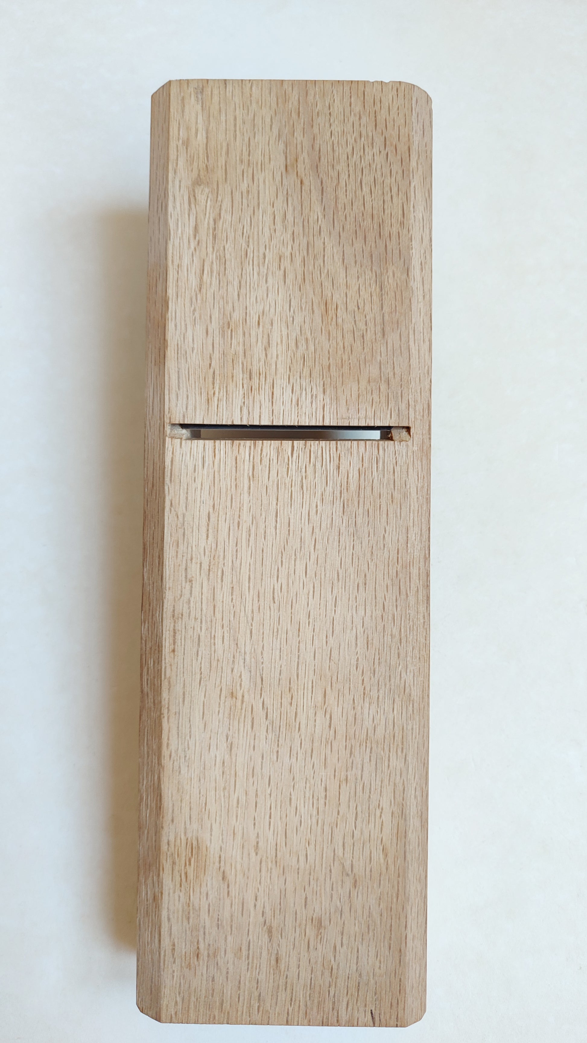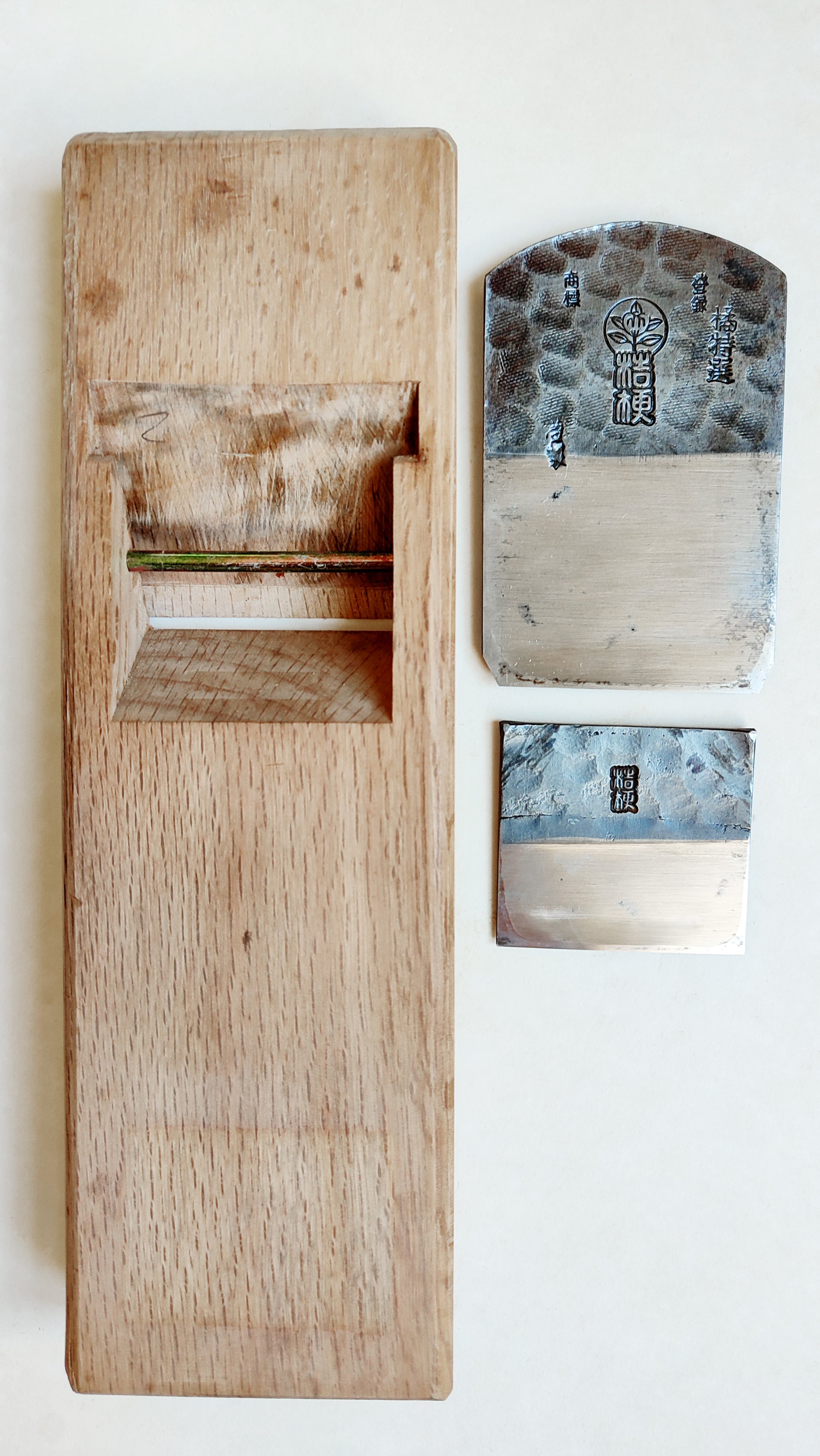 Le Daï (bloc en chêne blanc japonais) est en trés bon état. La semelle devra être aplani et réglé de nouveau. En effet avec le temps le bois bouge. Le Daï mesure: longueur 288mm, largeur 89mm, hauteur 36mm. Il a été chanfreiné au niveau de la semelle. C'est normal en faisant cela on réduit le contact en le réservant à la largeur du fer. Le dessus du daï a été également chanfreiné, c'est plus confortable pour les mains. Il n'y a pas d'orthodoxie sur les outils au Japon, chaque artisan les adaptes à son goût et à sa main. Le fer est en acier "spécial" carboné bi-couche forgé main, le contre fer est également laminé et signé.