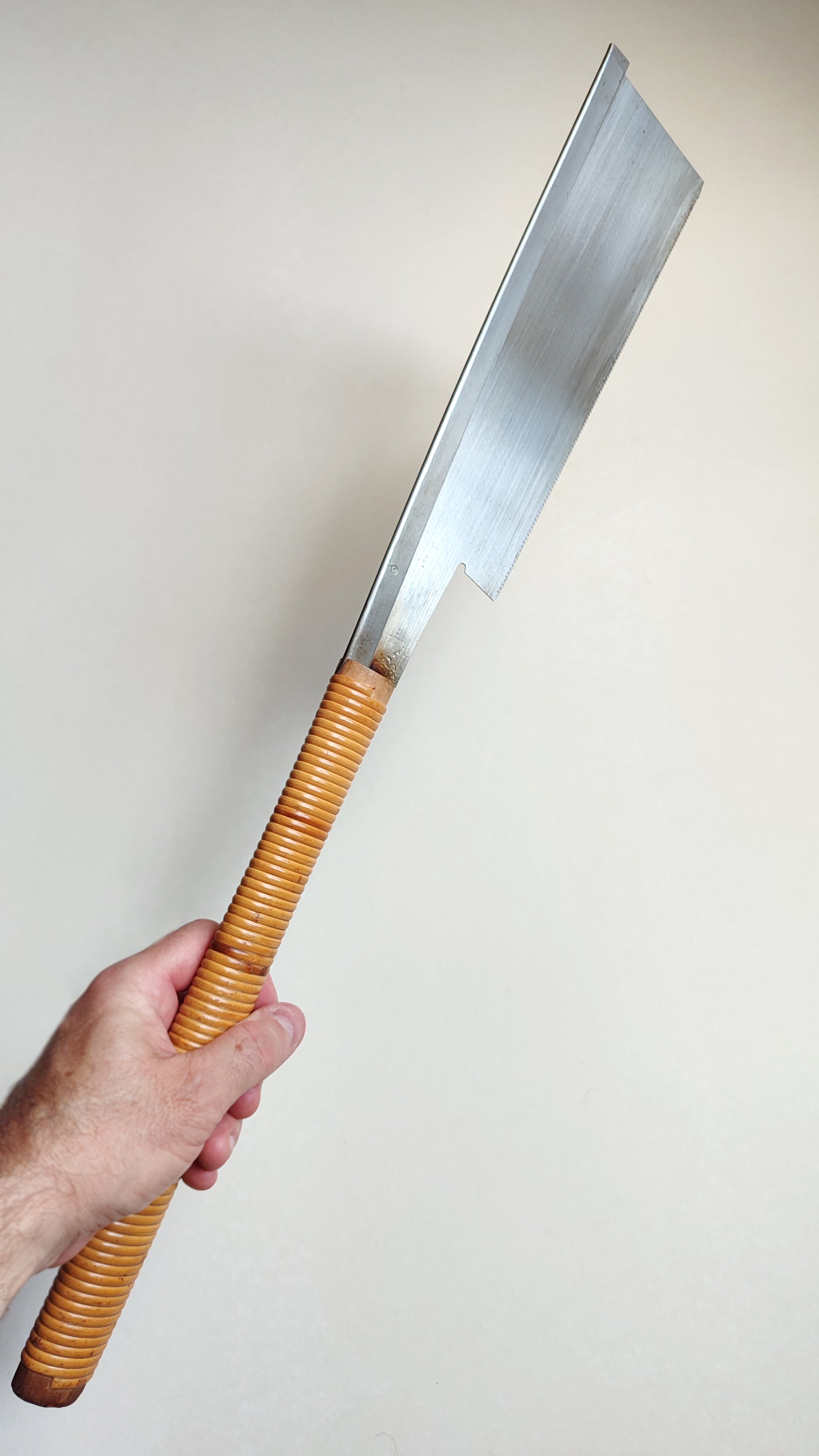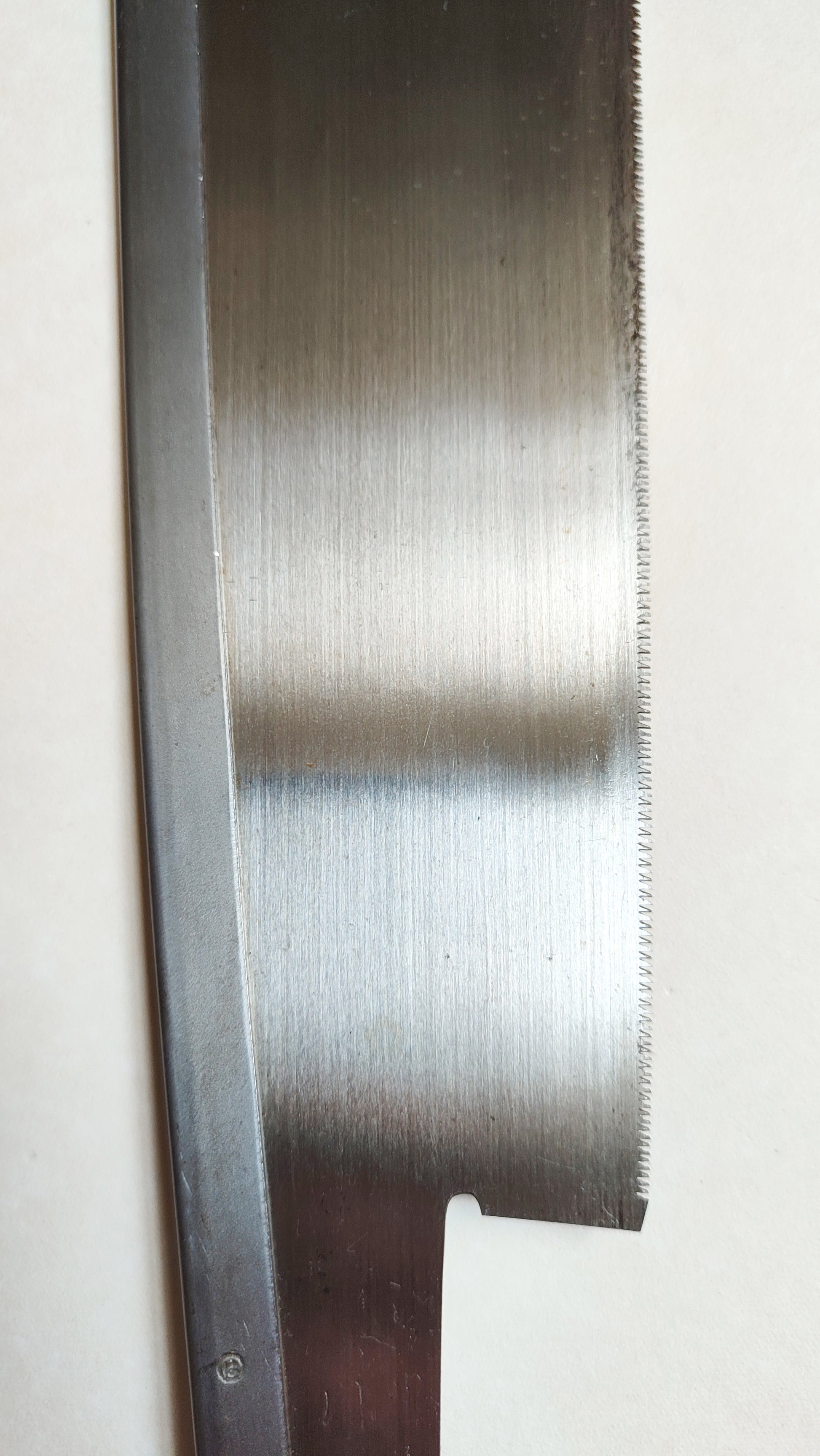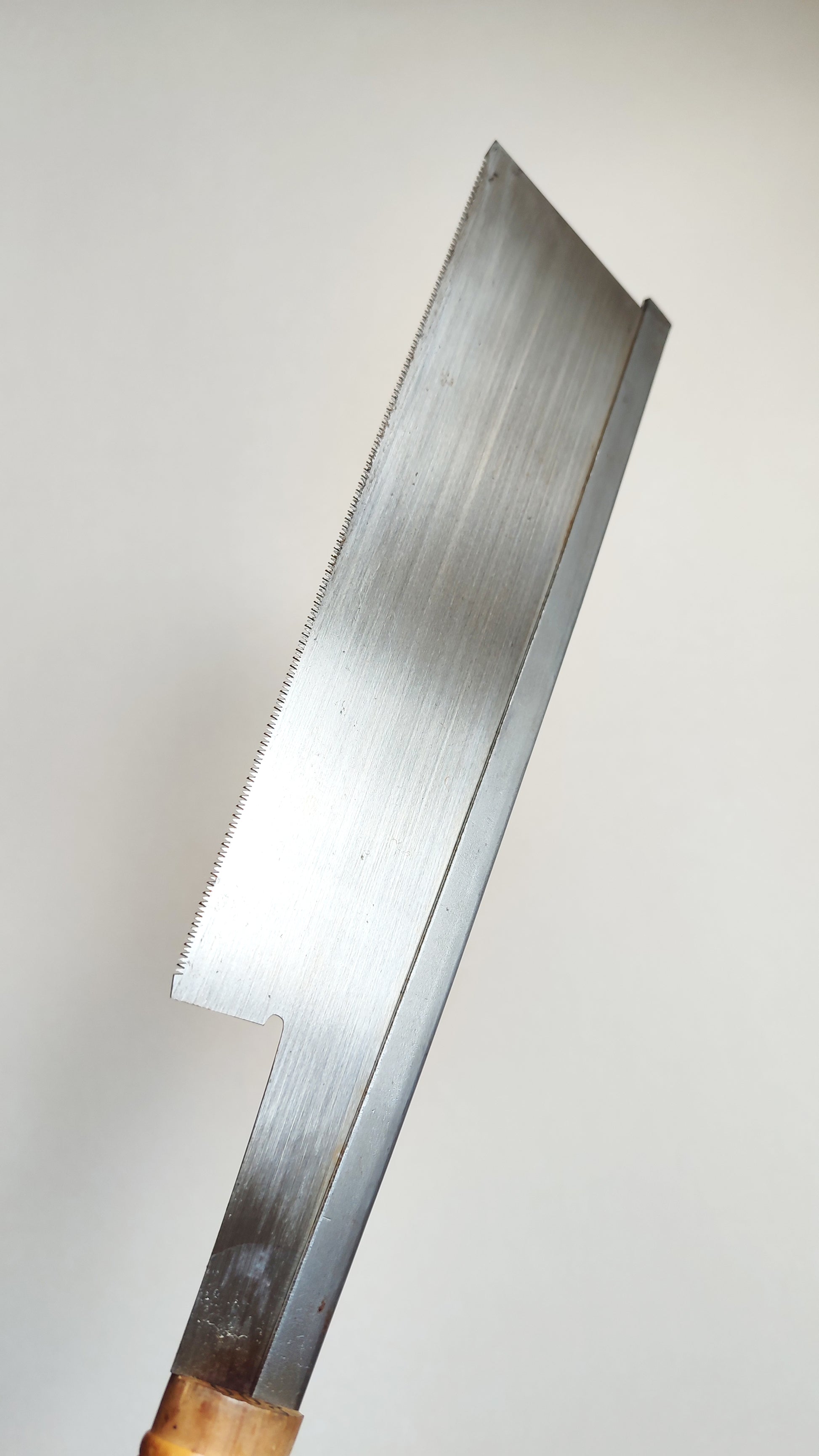 Its blade length (cutting part) is 240mm, its total length is 515mm. It is extra thin: 0.2mm. It is directly imported from Japan. This type of extra thin back saw allows to have a perfect cutting area for assemblies. The teeth are in perfect condition. This type of saw is very difficult to find in this quality (hand forged).