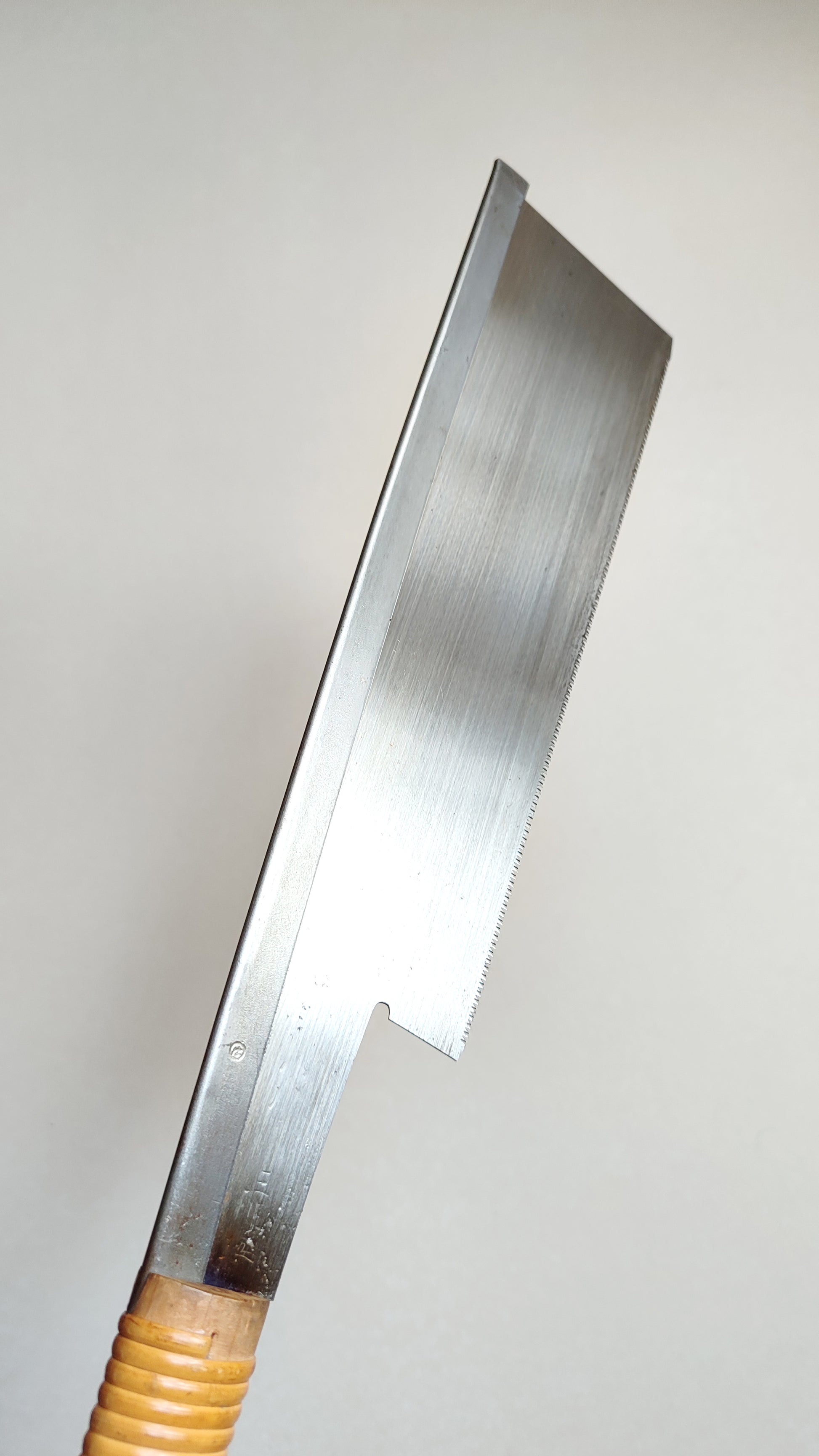 This Japanese handcrafted saw is forged. It is an extra-fine "Dozuki" (back) type called "Dozuki Nokogiri" (saw) more precisely. This is a vintage saw hand forged by "Sadaharu Okabe".