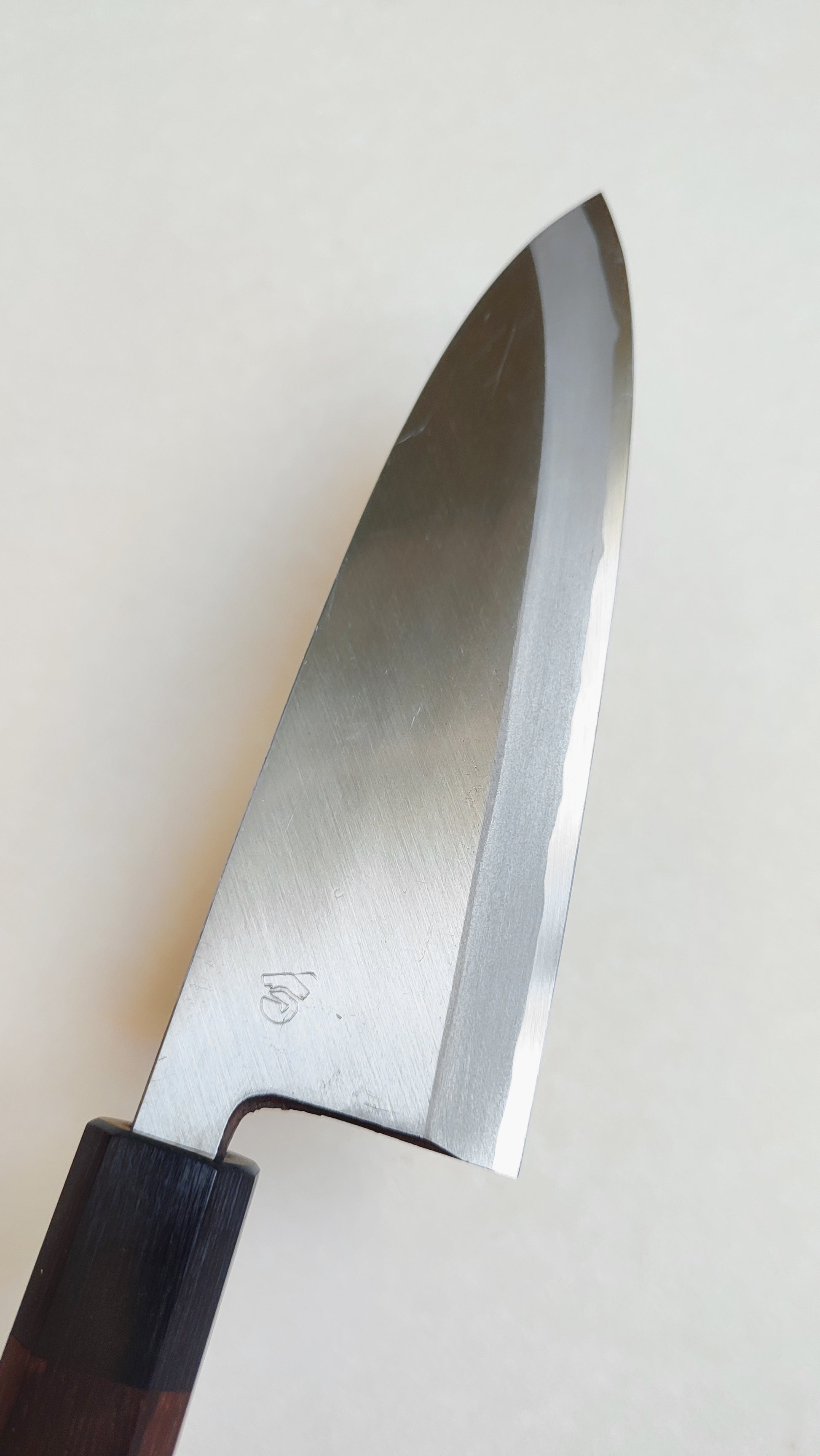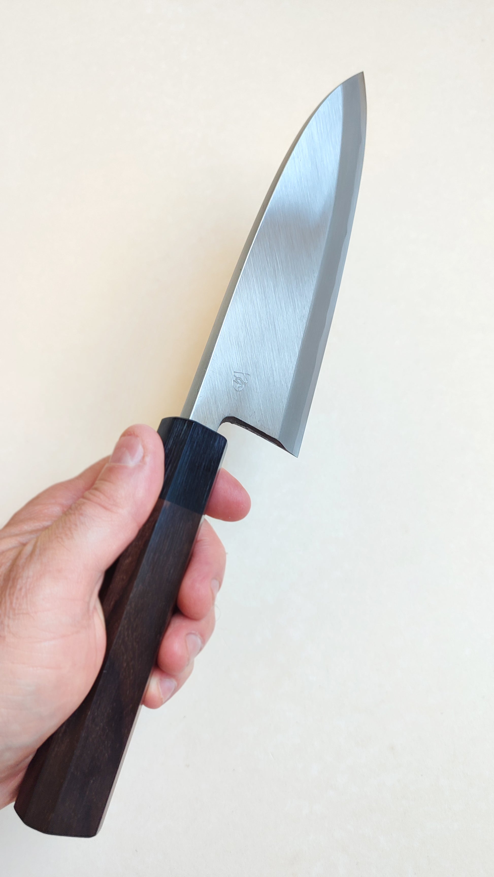 C'est un couteau épais pour travailler du poisson. Du désarêtage au parage c'est le parfait couteau pour nettoyer le poisson. La particularité du Deba c'est qu'il n'a qu'un seul biseau, le dos est plat. Ceci change la manière dont le couteau coupe. C'est un couteau qui à la l'origine est conçu pour nettoyer les poissons, mais il est très agréable dans bien d'autres utilisations.