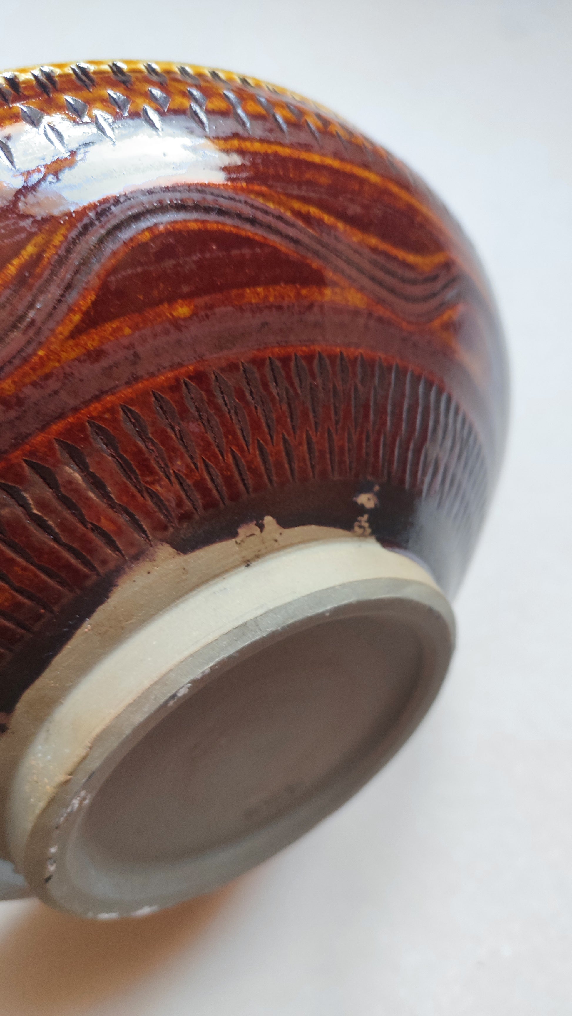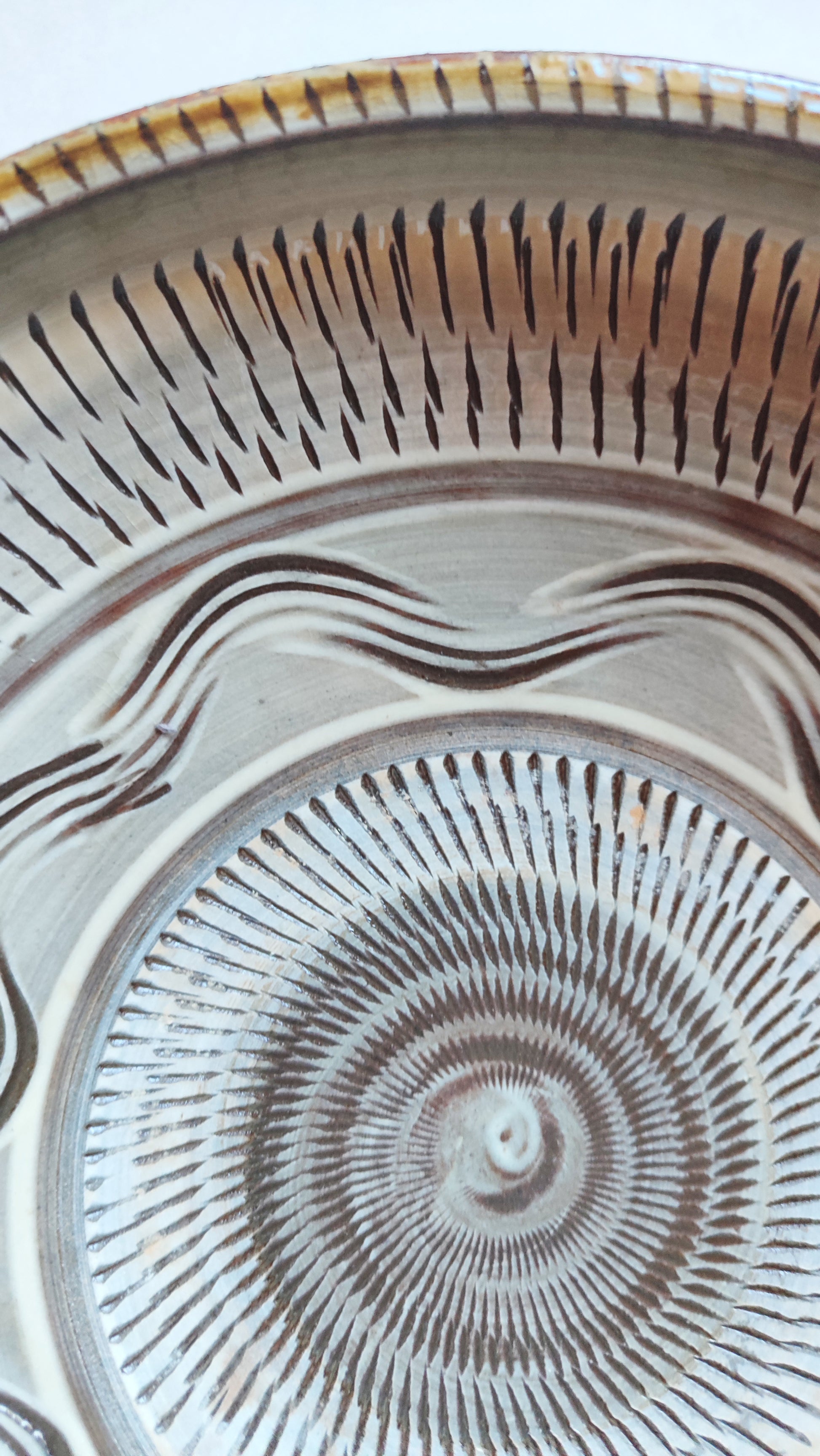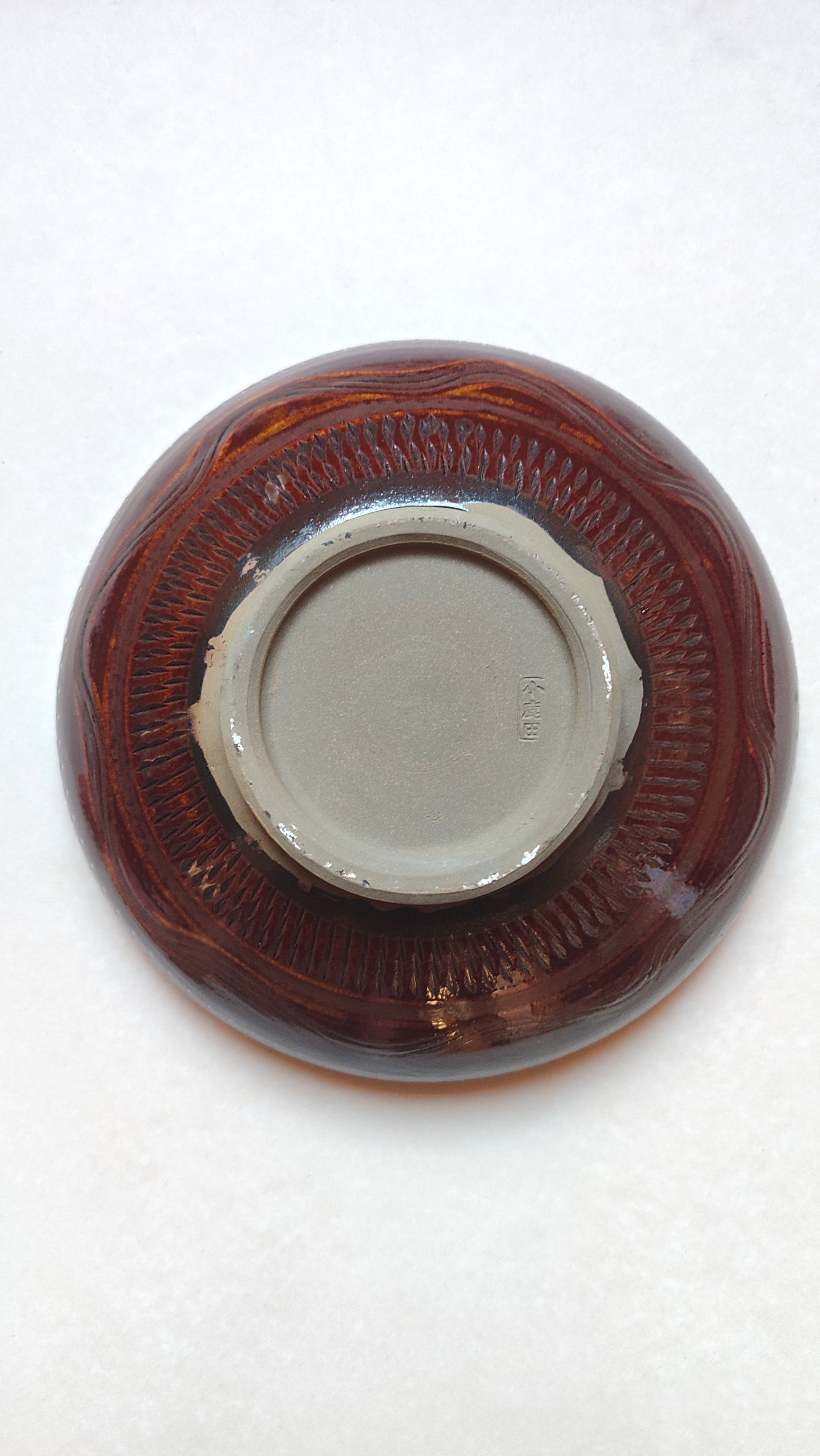 Elle mesure 238mm de diamètre et fait 75 de haut.Son décor cinétique est finement sculpté afin de révéler la terre sous l'émail. L'émaille est brillante et on peut apprécier les effets de relief du tournage.