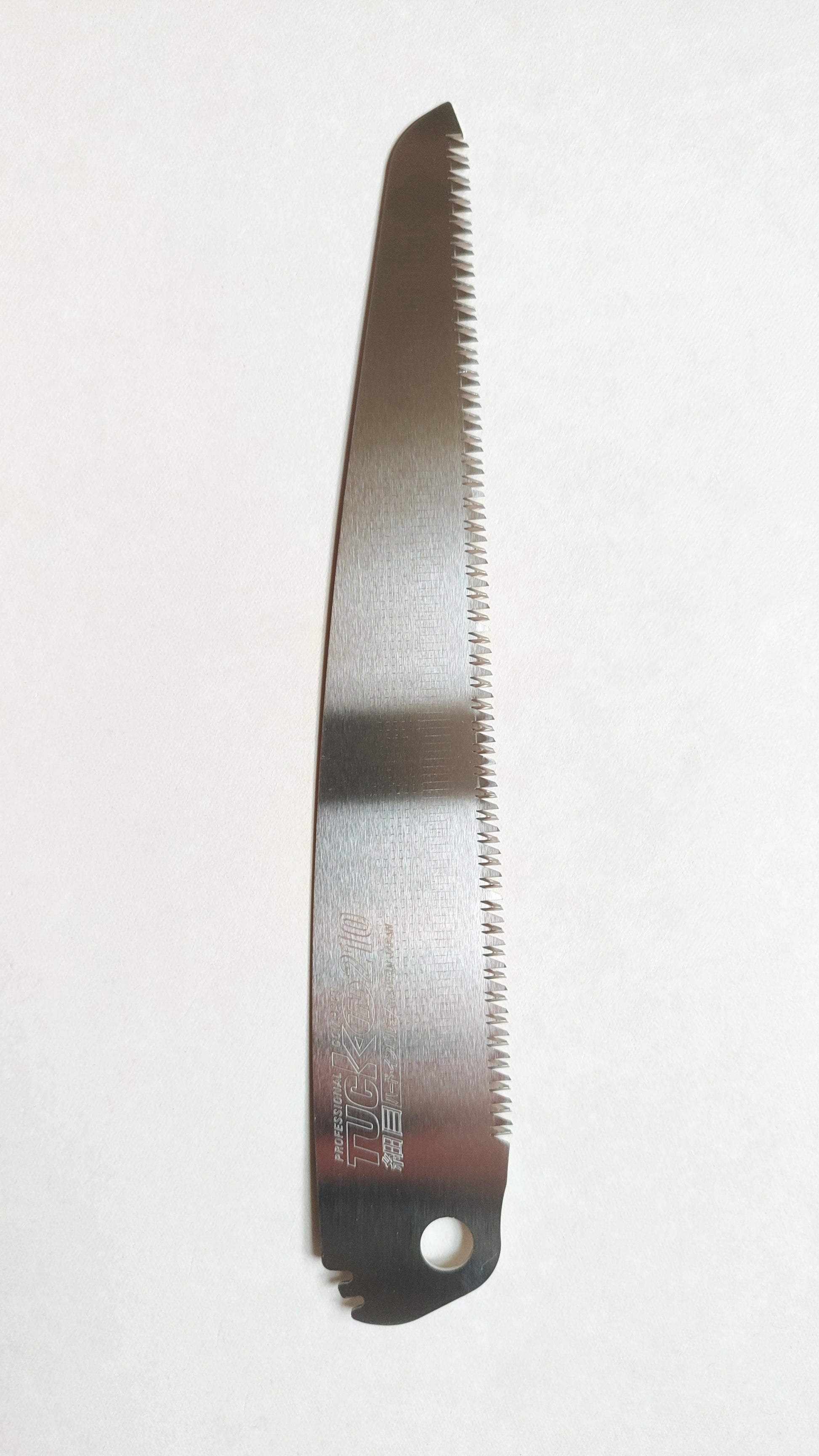 Cette lame de scie japonaise type "kataba" a une simple denture pour le travers du fil du bois. Sa longueur de lame est de 210mm, son épaisseur de 0,8mm. C'est une scie produite par la marque "Zsaw", les dents sont durcies par impulsion. Elle a une denture spécifique qui travaille aussi bien en travers du fil que dans le sens du fil.