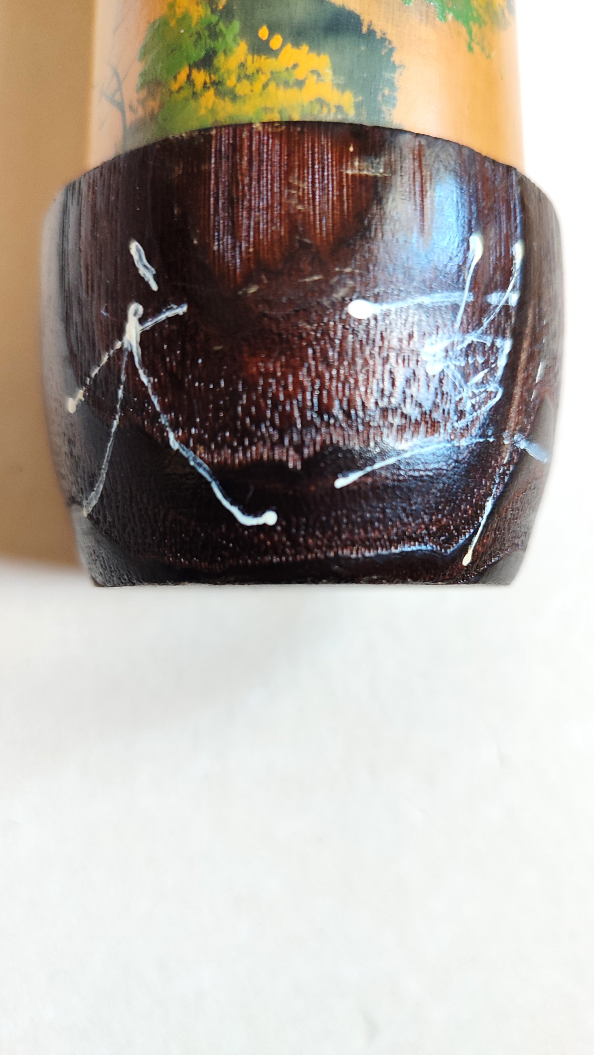 Cette poupée japonaise est appelée "Kokechi". Ce style de Kokeshi créative est appelé "Sosaku". Cette kokeshi de la ville de Tohoku au nord arbore un joli décor peint au niveau de la ceinture. Ce décor évoque une maison de montagne. Les kokeshi sont le plus souvent tournées dans de l'érable, du cerisier, du poirier ou de l'érable.