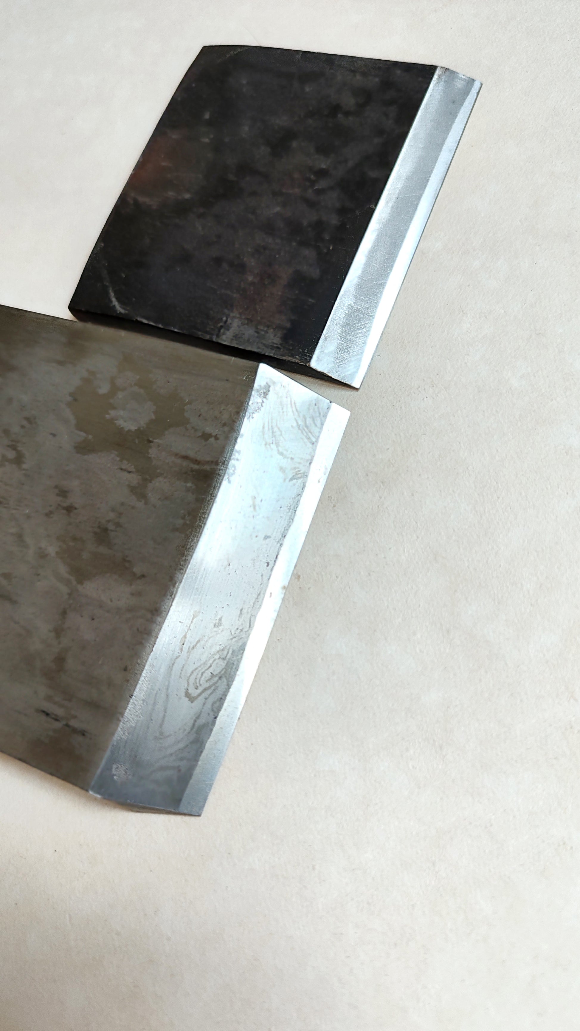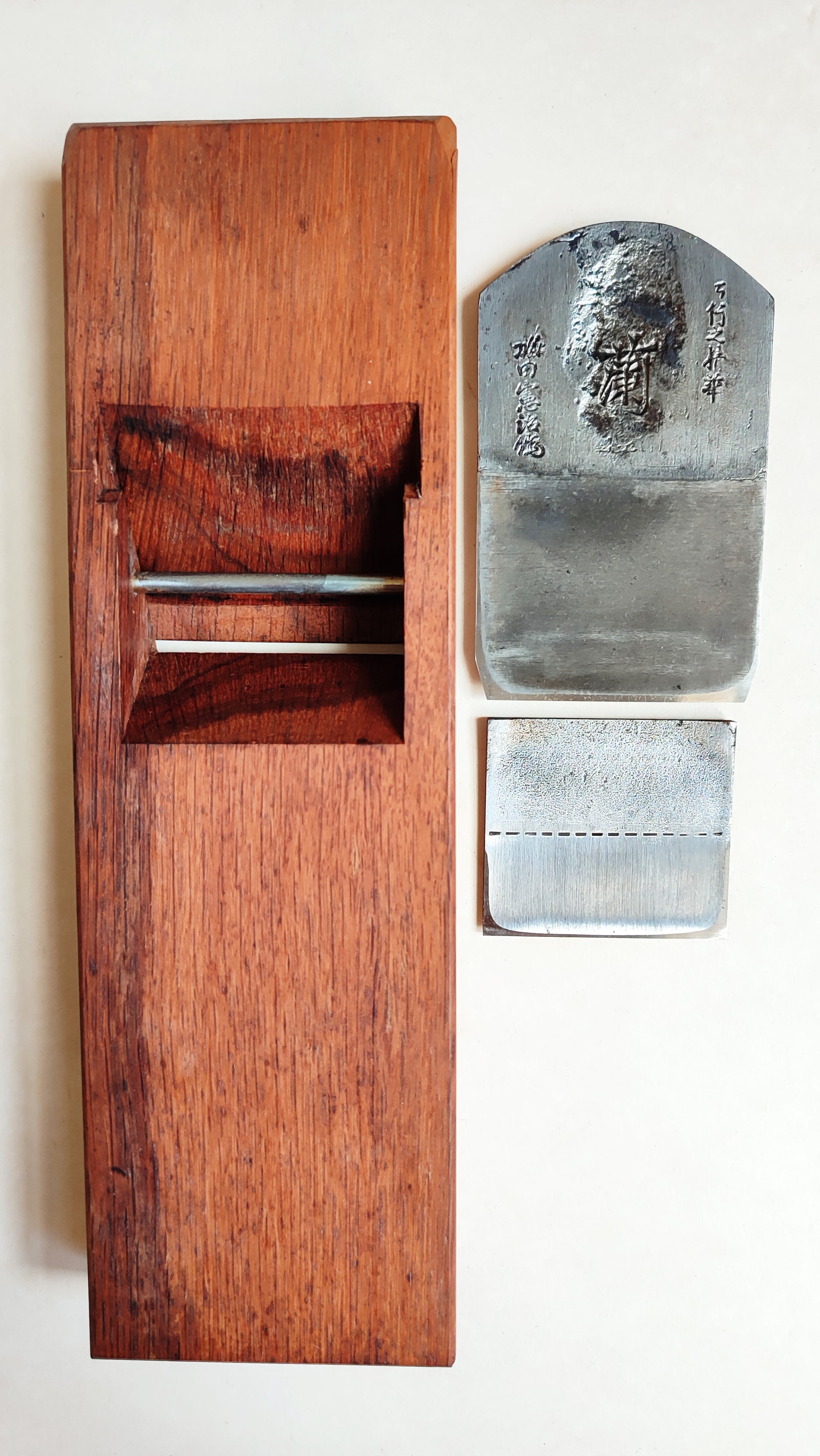 Le Daï (bloc en chêne blanc japonais) est massif et en parfait état, la semelle est bien droite. Le Daï mesure: longueur 274mm, largeur 85mm, hauteur 37mm. Le fer est en acier suédois hautement carboné bi-couche forgé main. La signature est frappée au poinçon en profondeur et composée graphiquement et le fer très épuré, le contre-fer est épais et également signé. Il s'agit d'une forge à l'ancienne, charbon et trempe à l'eau avec un recuit à la glaise. On peut voir le recuit à l'arrière du fer avec sa ligne de démarcation à mi hauteur.