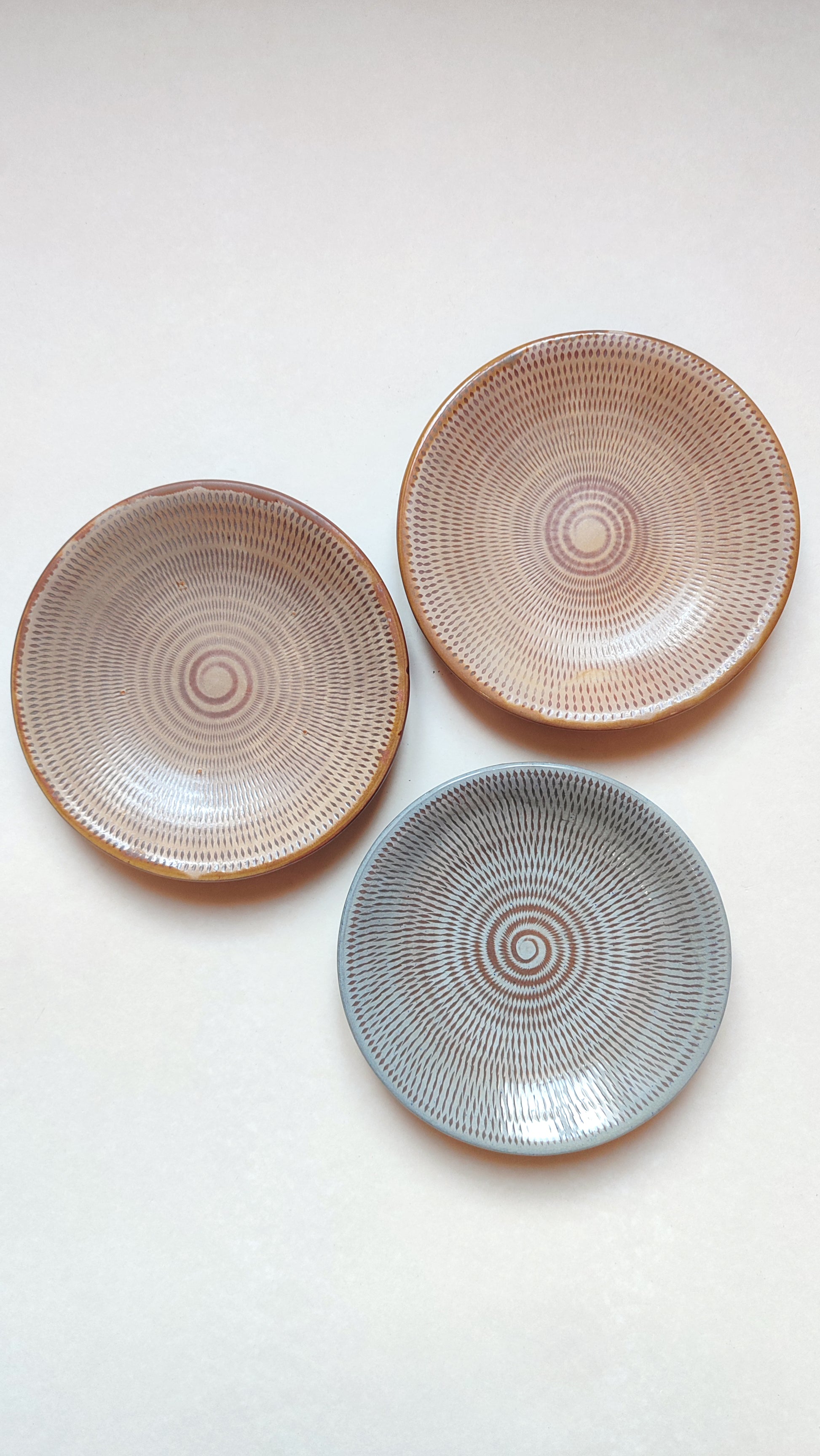 Ce trio d'assiettes finement décorées est du style "Oishiwara" qui correspond à la ville éponyme. Elles mesurent 188mm de diamètre. Leur décor cinétique est finement sculpté afin de révéler la terre sous l'émail.