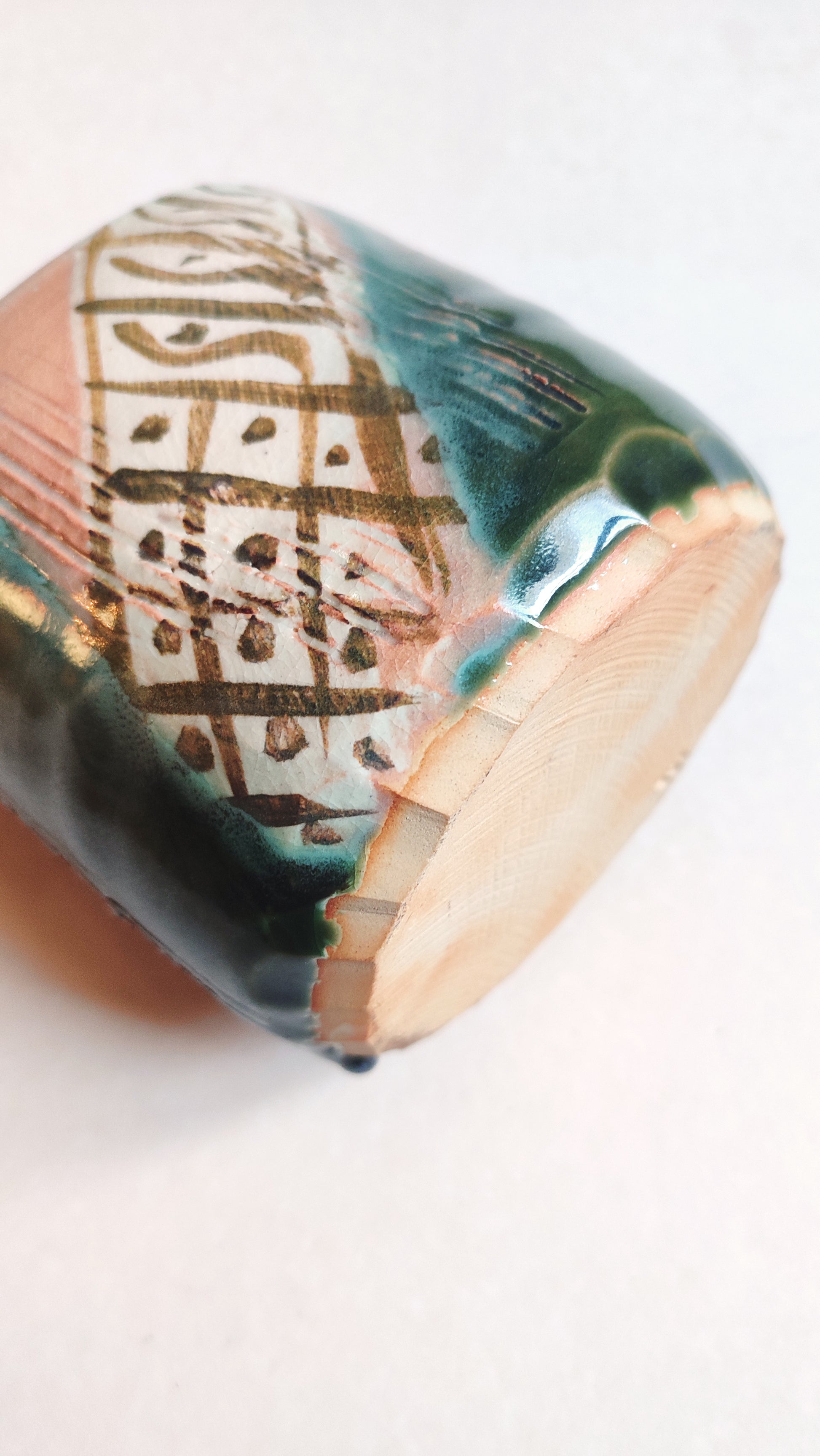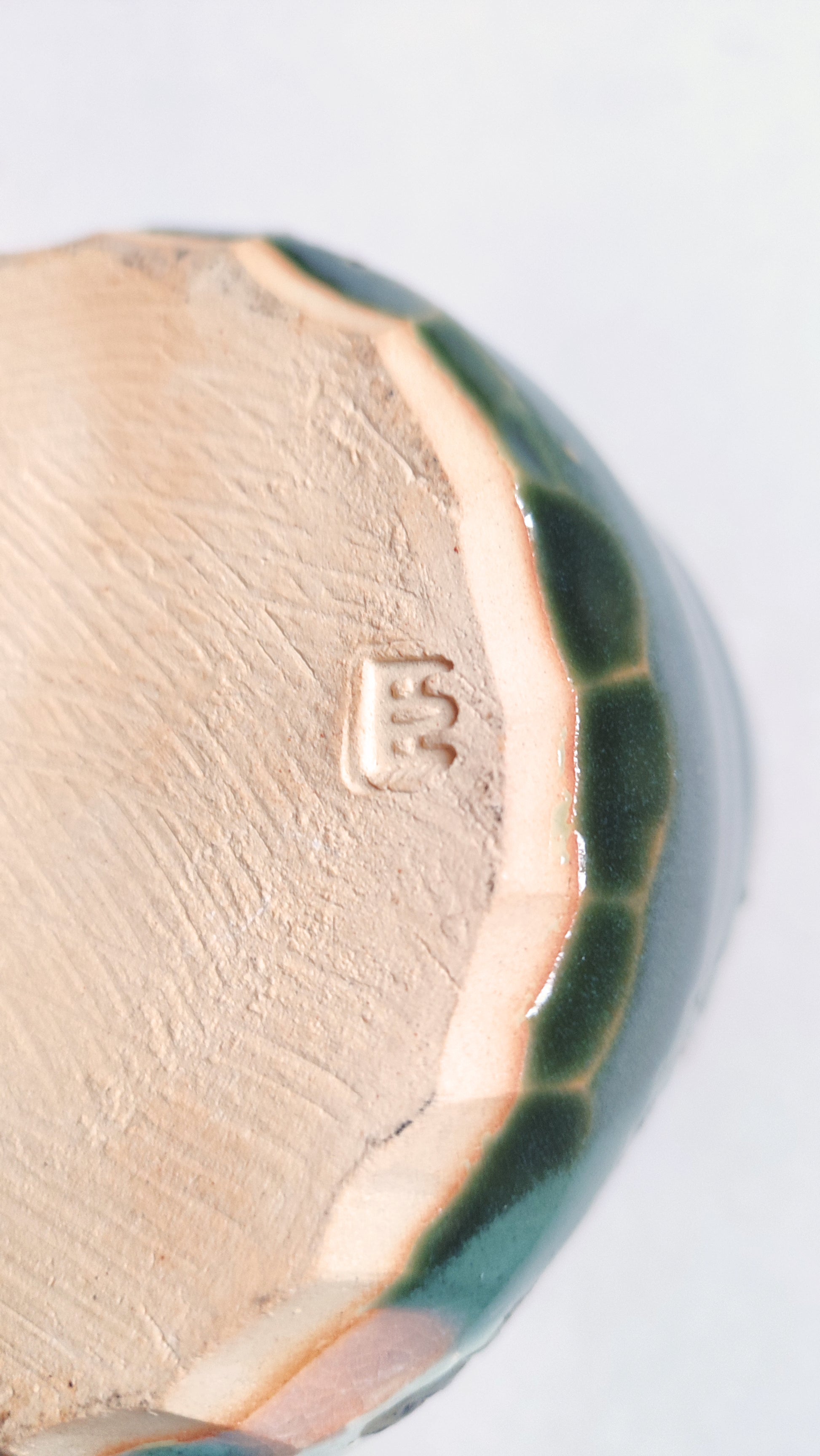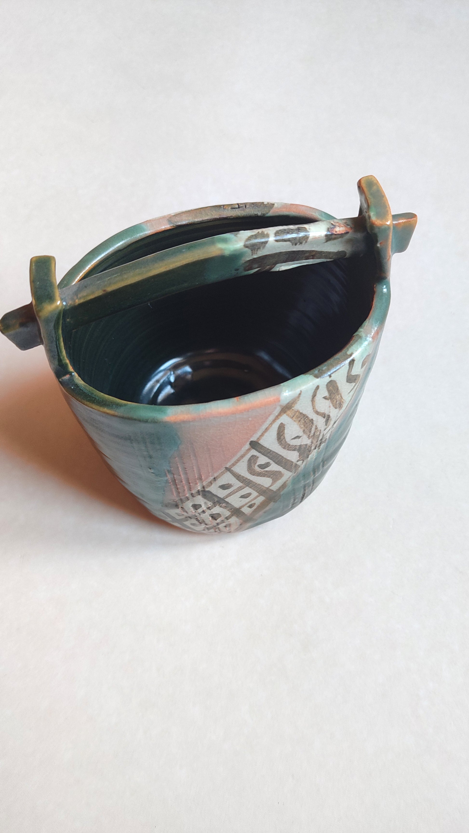 Ce vase évoquant le seau typique du Japon provient des céramiques "Oribe". Son décor peint et les couleurs utilisées sont caractéristique de ce style.