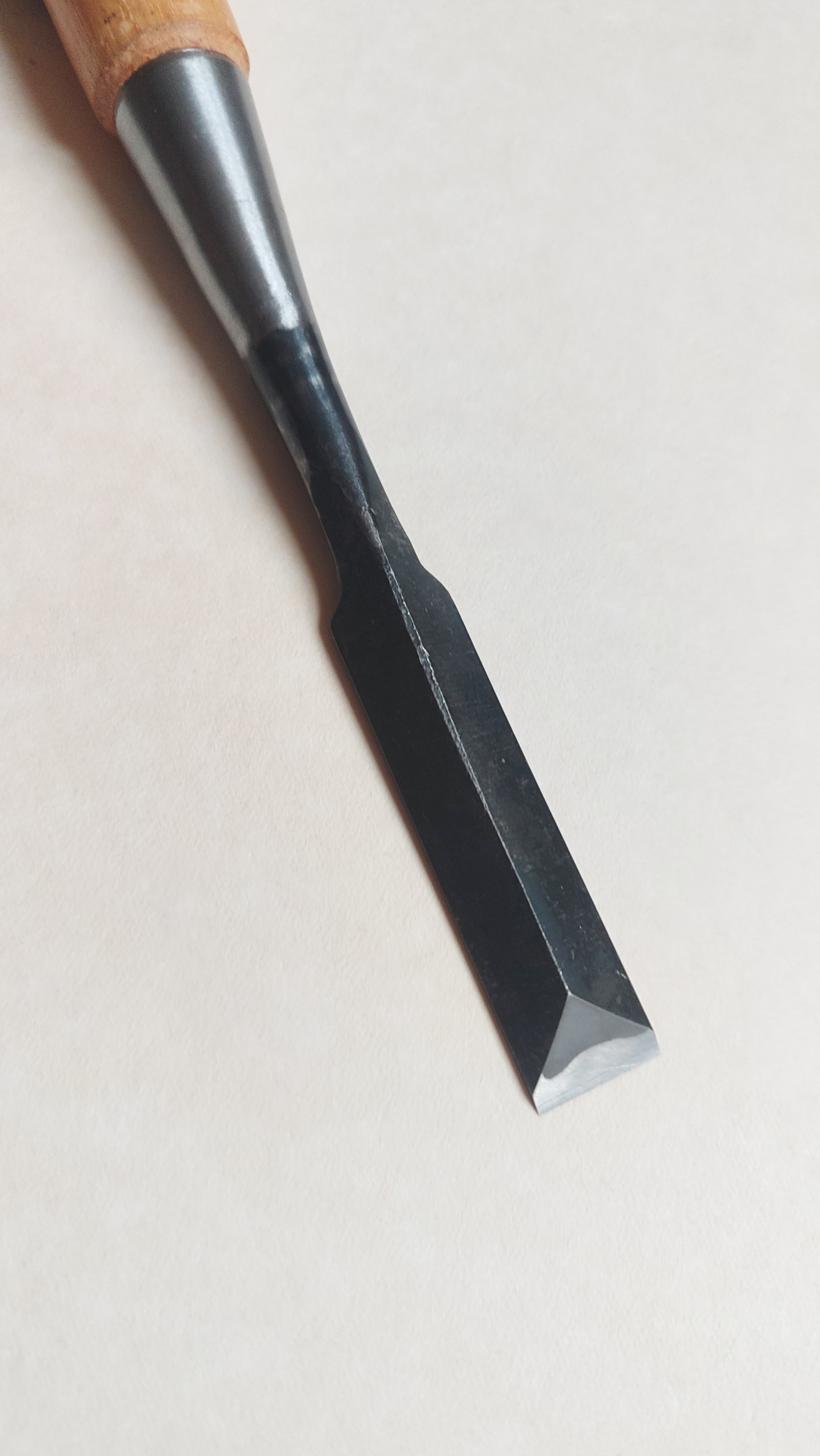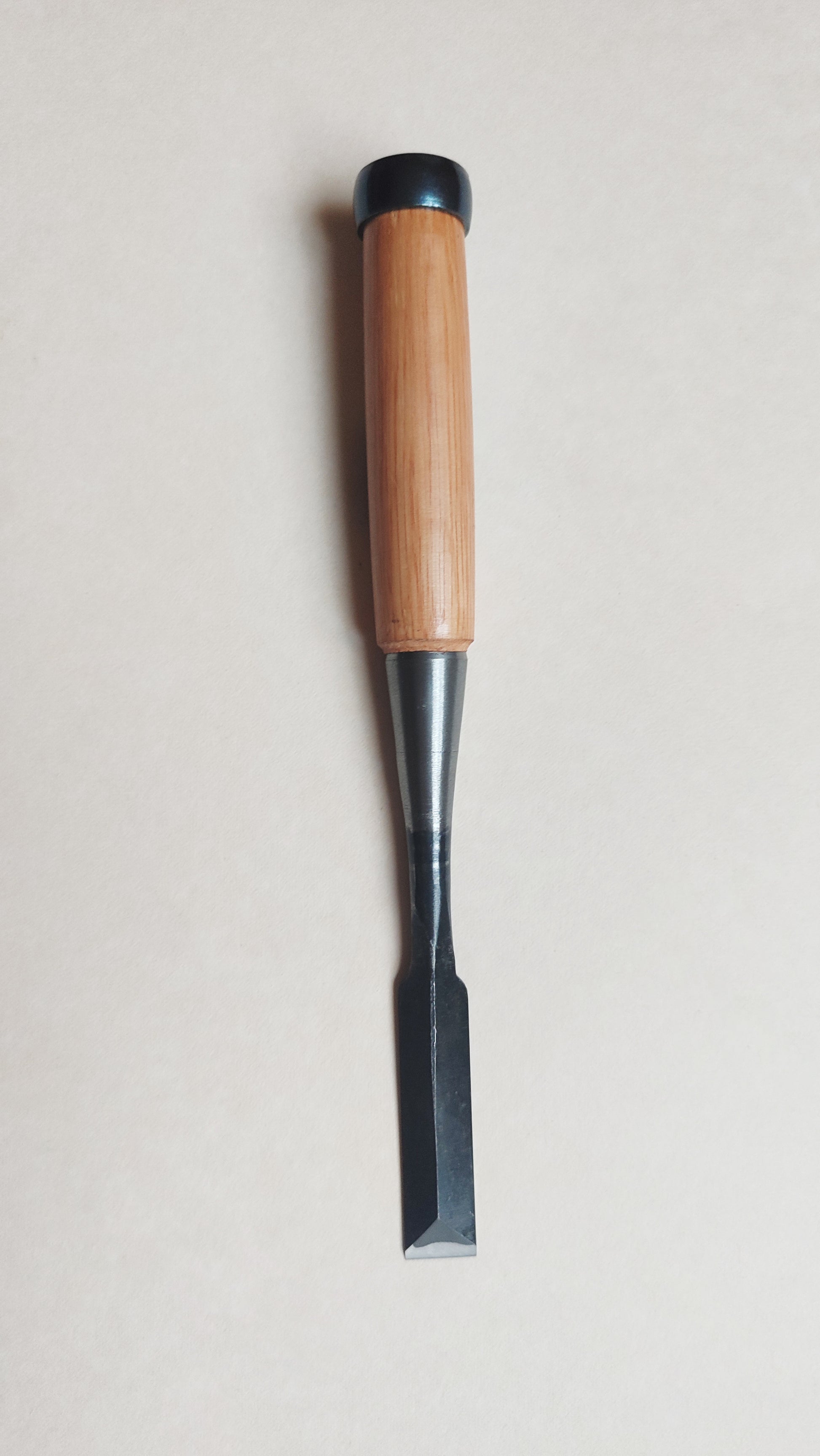 Le manche est en chêne rouge c du Japon. L'Ura (forme à l'arrière du fer) est parfaitement exécutée. C'est un ciseau de la marque Yasaku produite en moyenne série dans la ville de Miki. Le fer est en acier blanc (white steel 1) carboné bi-couche forgé main, il y a une couche épaisse d'acier dur (gage de qualité).