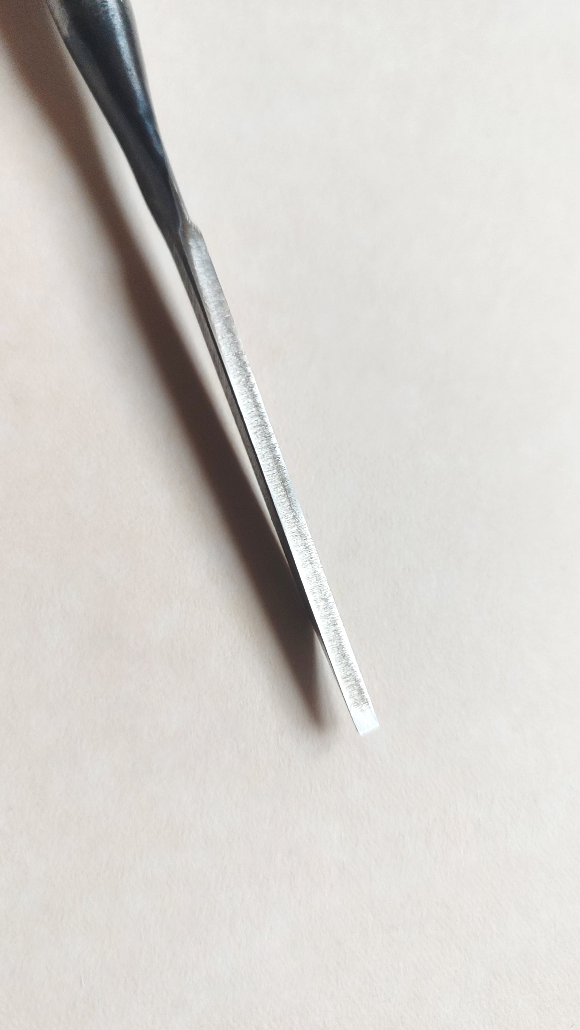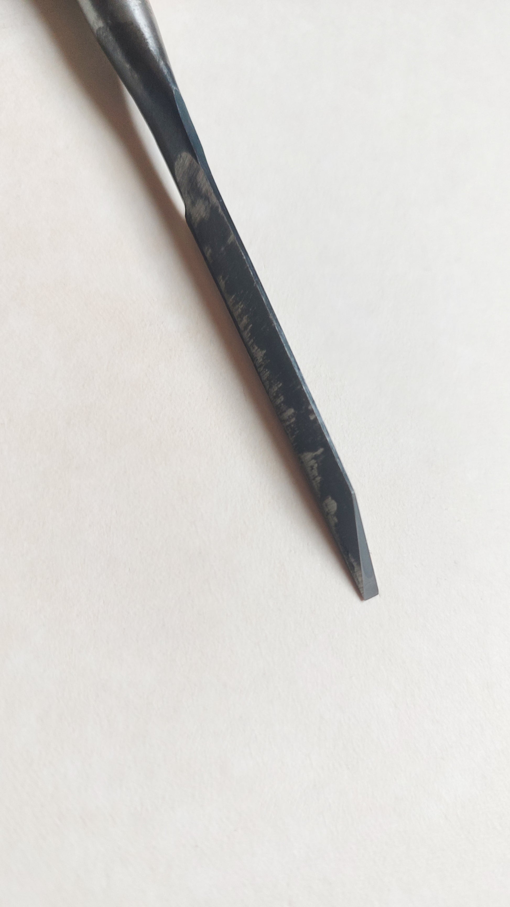 Ces ciseaux "Oire Nomi" sont courts. Ils sont très agréables pour les petits travaux d'ébénisterie. Celui-ci a la forme dîtes "Shinogi" (arrête) de forme pyramidale. Ce sont de trés bon ciseaux pour découvrir quelques choses de plus haut de gamme et pour approfondir l'usage de tels ciseaux.