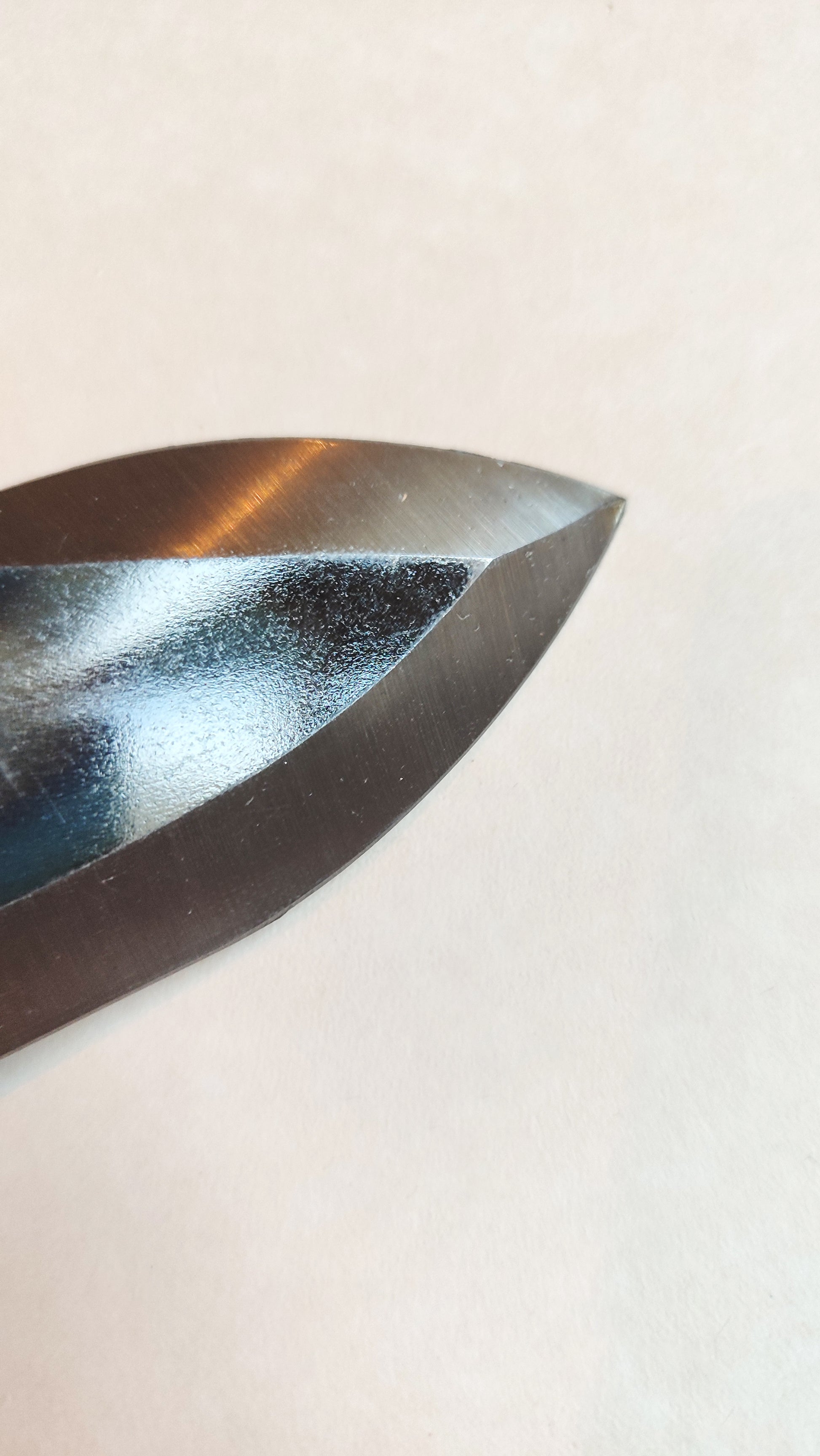 La lame fait 165mm de long et la longueur totale du couteau fait 300mm. Il a une émouture plate et convexe au dos ce qui facilite son affûtage. Le manche est en hickory avec des rivets en laiton, il est trés durable.