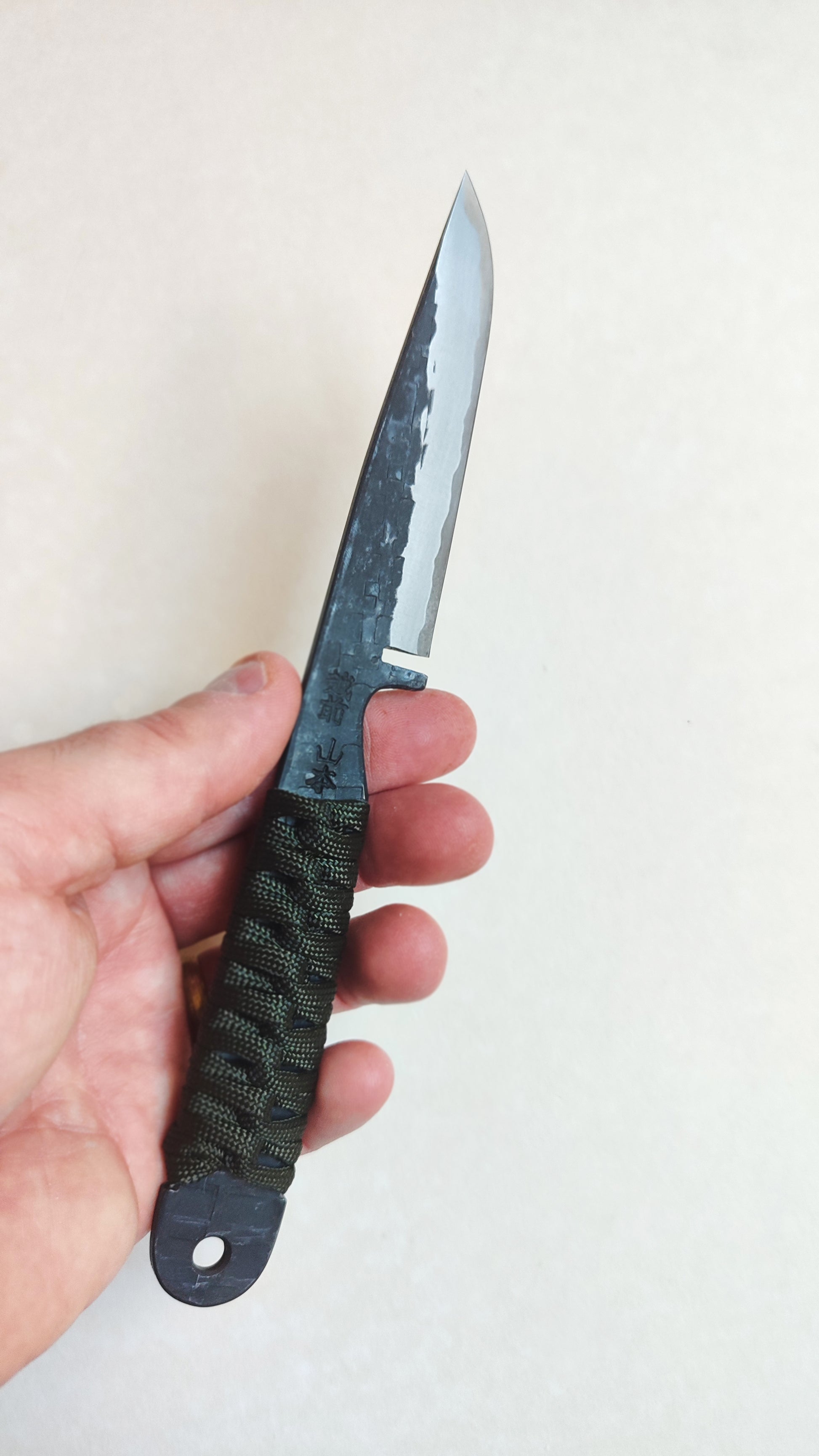 La longueur du tranchant est de 92mm, la longueur totale est de 210mm. Le manche est de seul tenant et mesure 118mm de long. Il a un tranchant a double biseau et sa lame est forgée main en acier tri-couche hautement carboné SK.