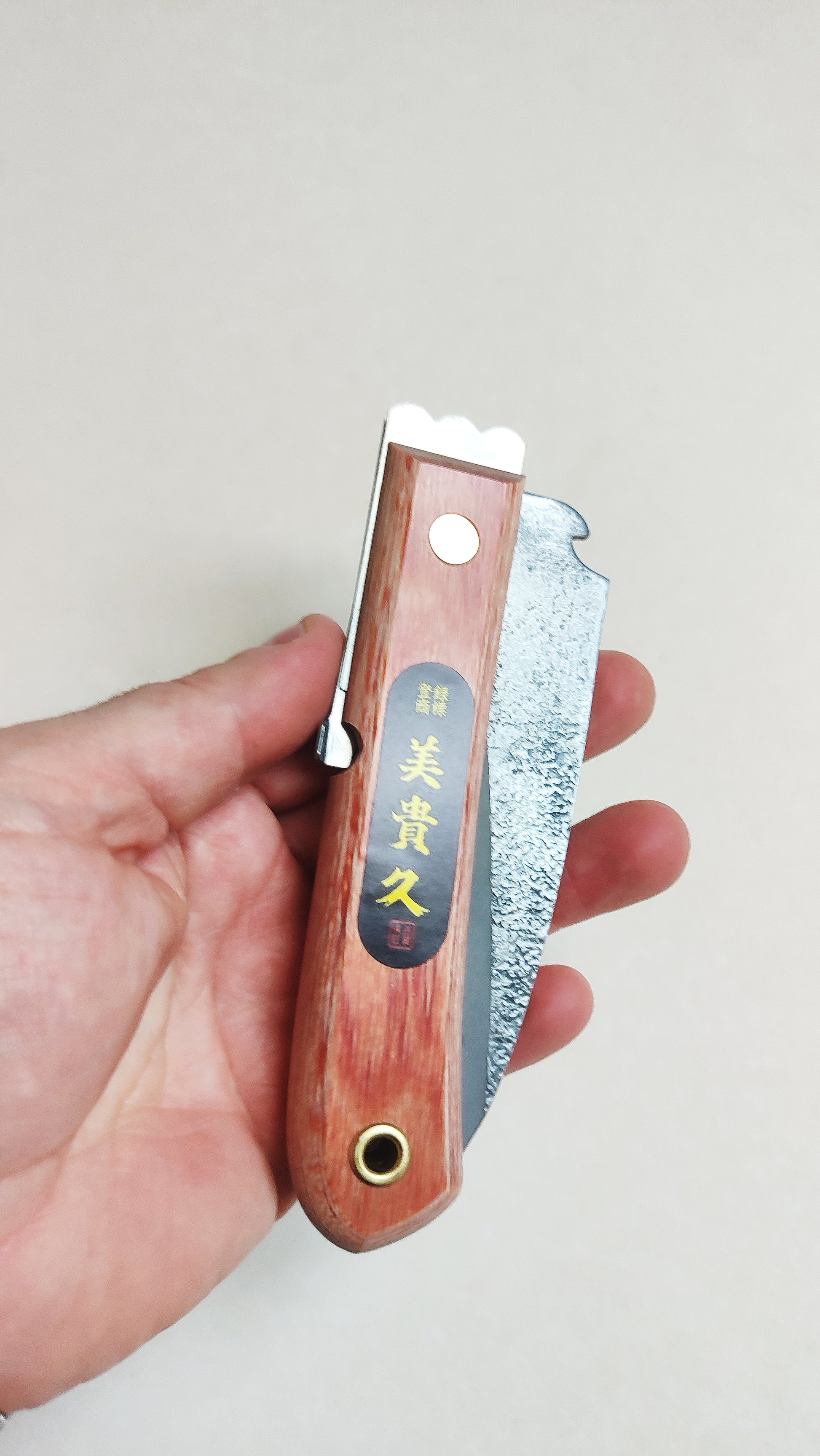 Ce couteau japonais pliant appelé "Kiridashi" sera utile pour une multitude de tâches: marquage du bois, sculpture... Il est produit par la marque "Mikihisa" dans les ateliers "Ikeuchi Hamono" dans la ville de Miki berceau de l'outillage au Japon. La grande qualité de fabrication est trés rigoureuse dans les ateliers Ikeuchi fondés en 1953. Depuis cette date quatre génération de forgeron ce succèdent et perpétue la tradition des différents modèles des marques Mikihisa et Ikeuchi.