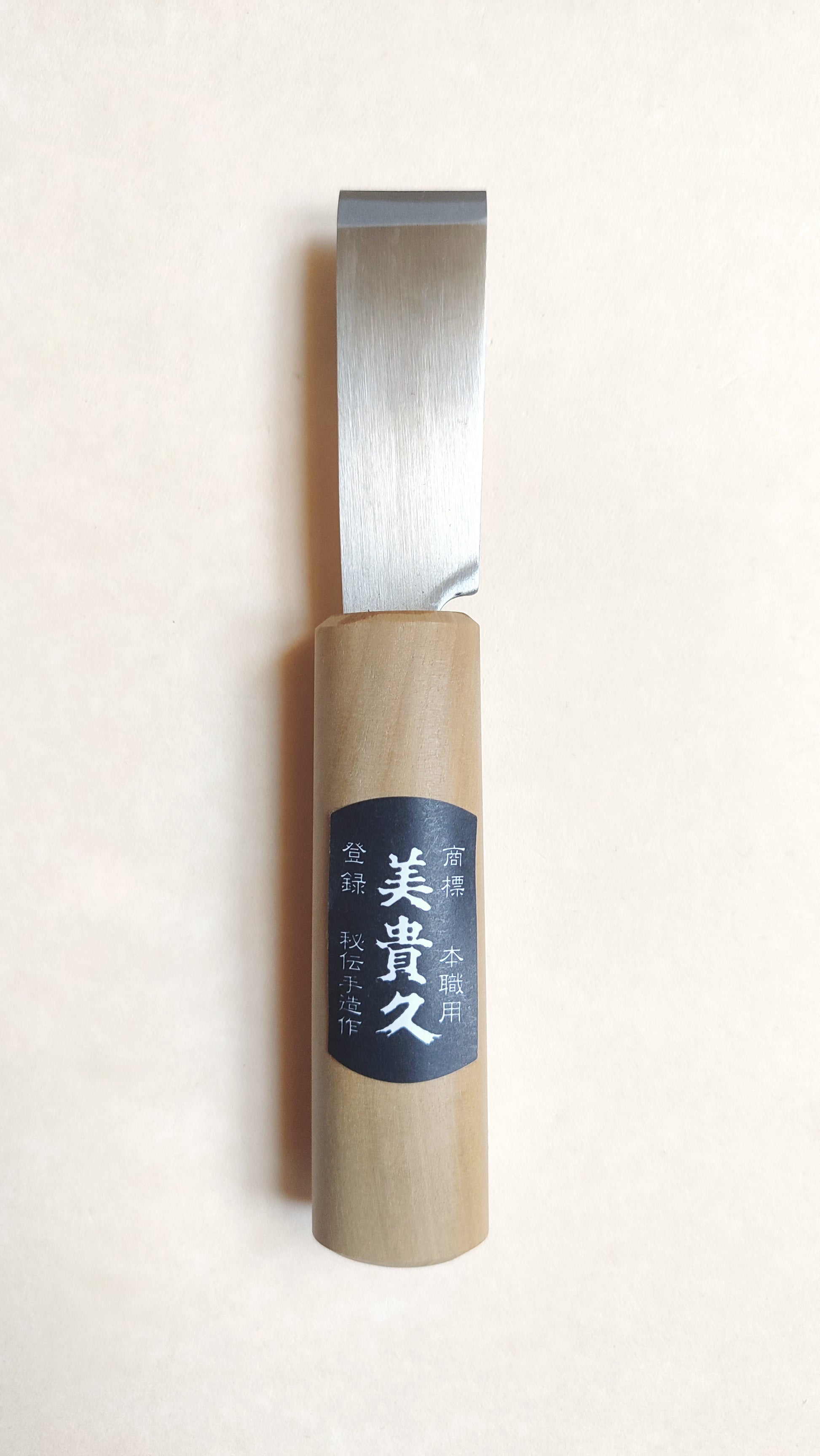 Ce couteau japonais est destiné au travail du cuir. La lame fait 24mm (tranchant) de large, sa longueur est de 65mm, l'épaisseur est de 2mm. Le fer est en acier hautement carboné forgé bi-couche. Il a été fabriqué par l'atelier "Ikeuchi Hamono" dans la ville de Miki berceau de l'outillage au Japon. La grande qualité de fabrication est trés rigoureuse dans les ateliers Ikeuchi fondés en 1953. Depuis cette date quatre génération de forgeron ce succèdent et perpétue la tradition des différents modèles des marques Mikihisa et Ikeuchi.