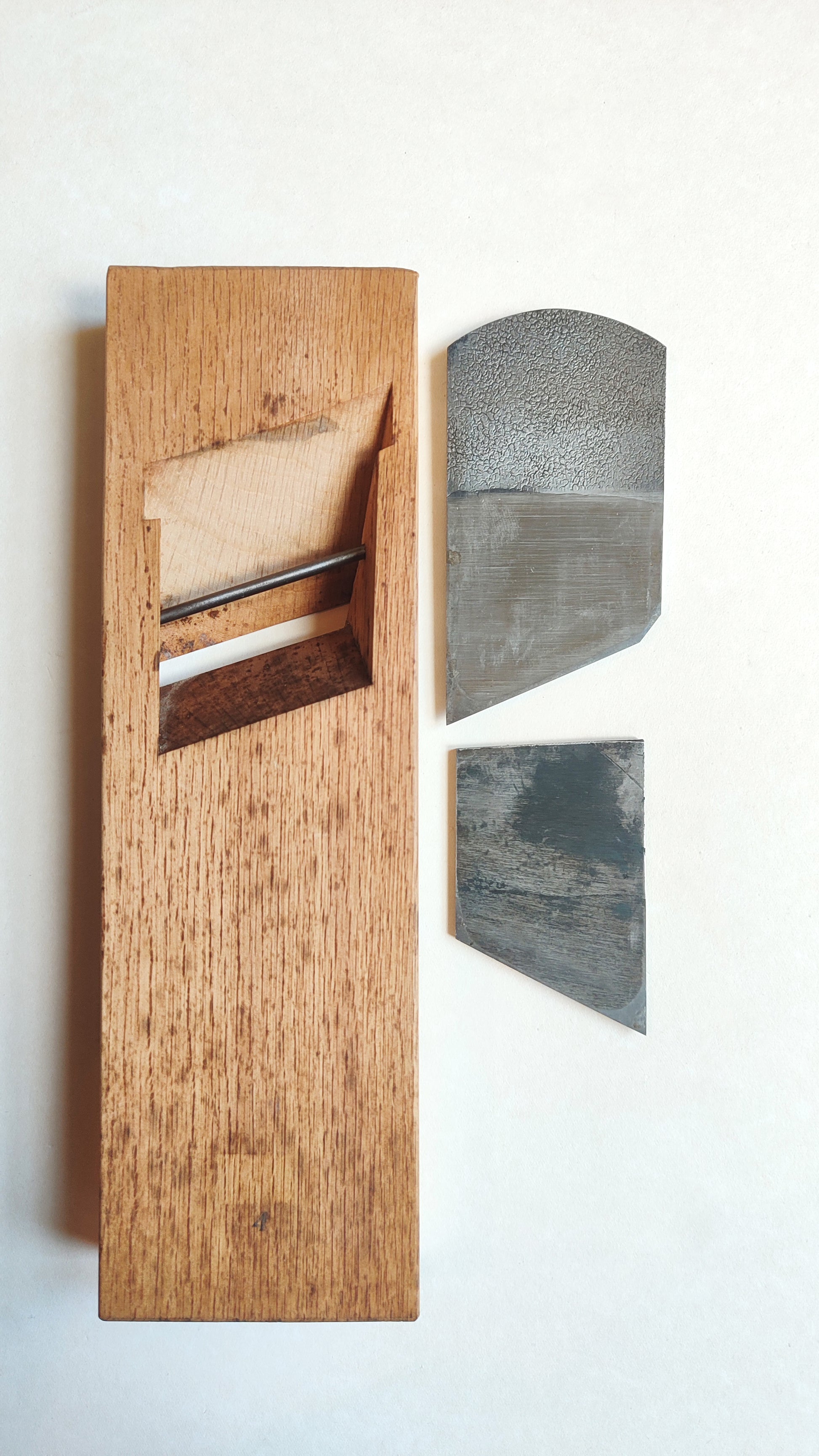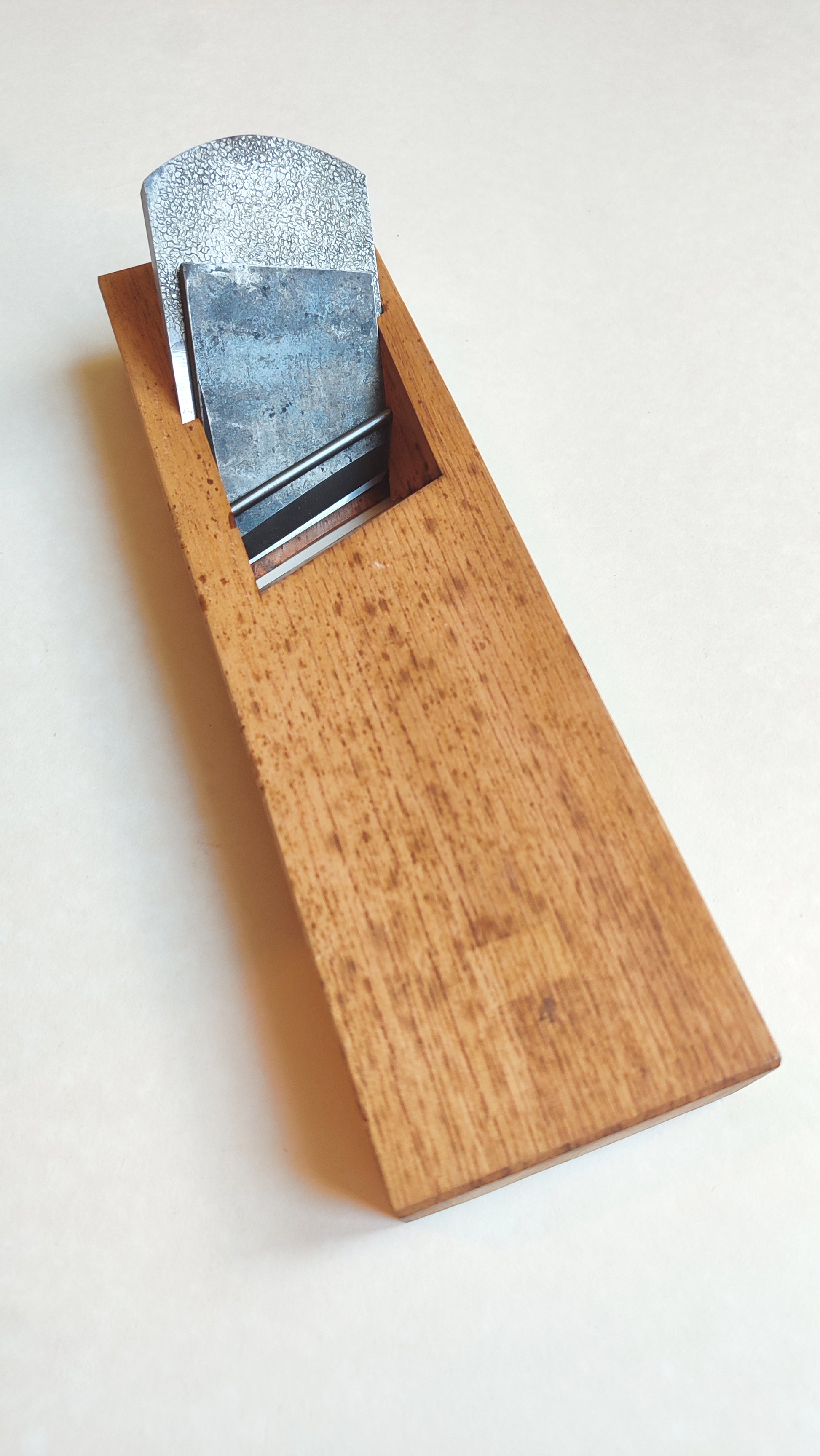 Le fer est en acier forgé hautement carboné bi-couche. L'acier de support (jigane) est en kamaji (vieil acier fondu). Le contre-fer est d'origine et il est laminé. Le tranchant fonctionne parfaitement. Le Daï (bloc de bois) est en parfait état.