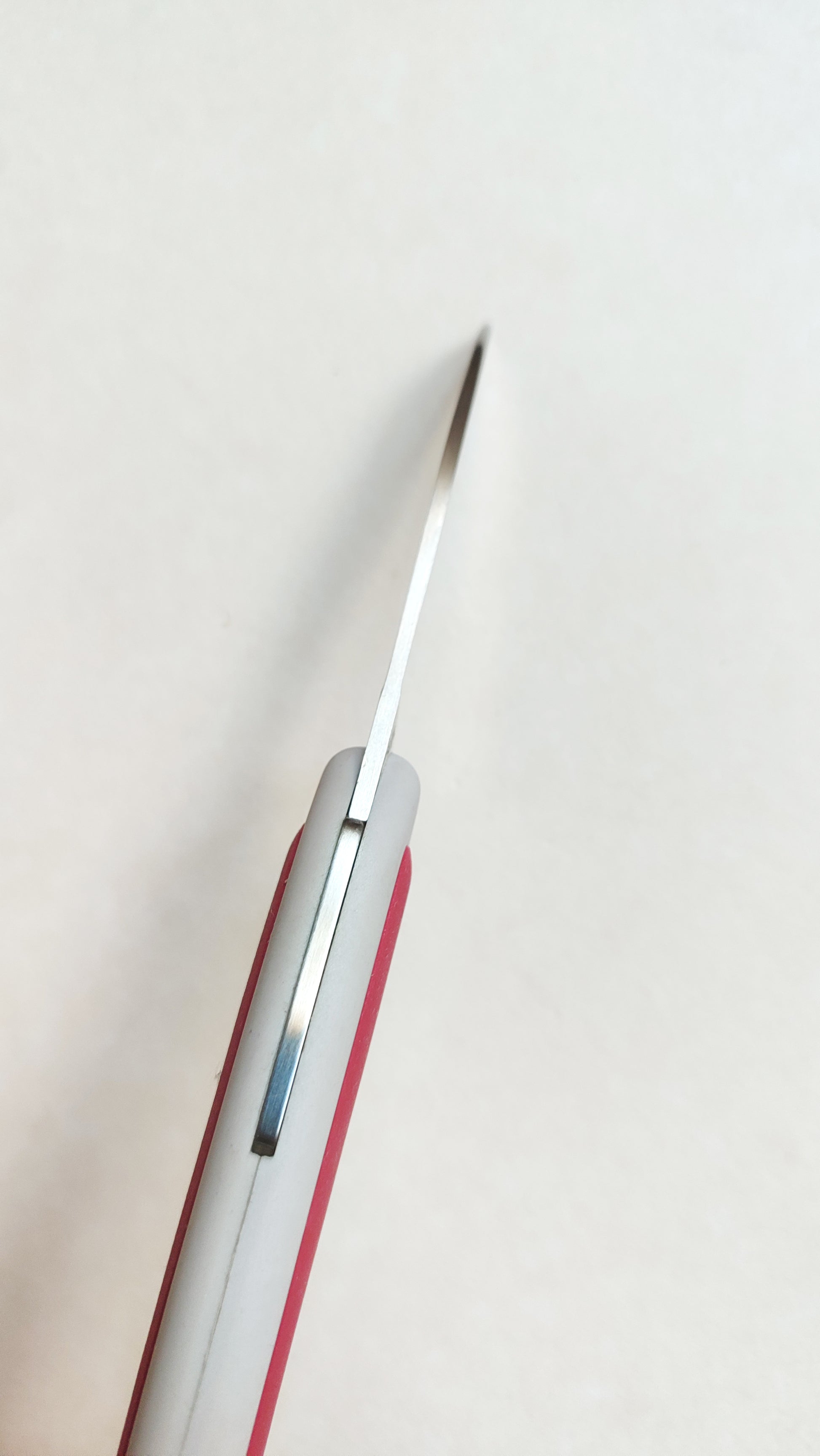 La lame fait 55mm de long. Il a une émouture droite donc son acier inoxydable sera facile à affûter. Le manche possède un grip rouge pour une bonne prise en main.
