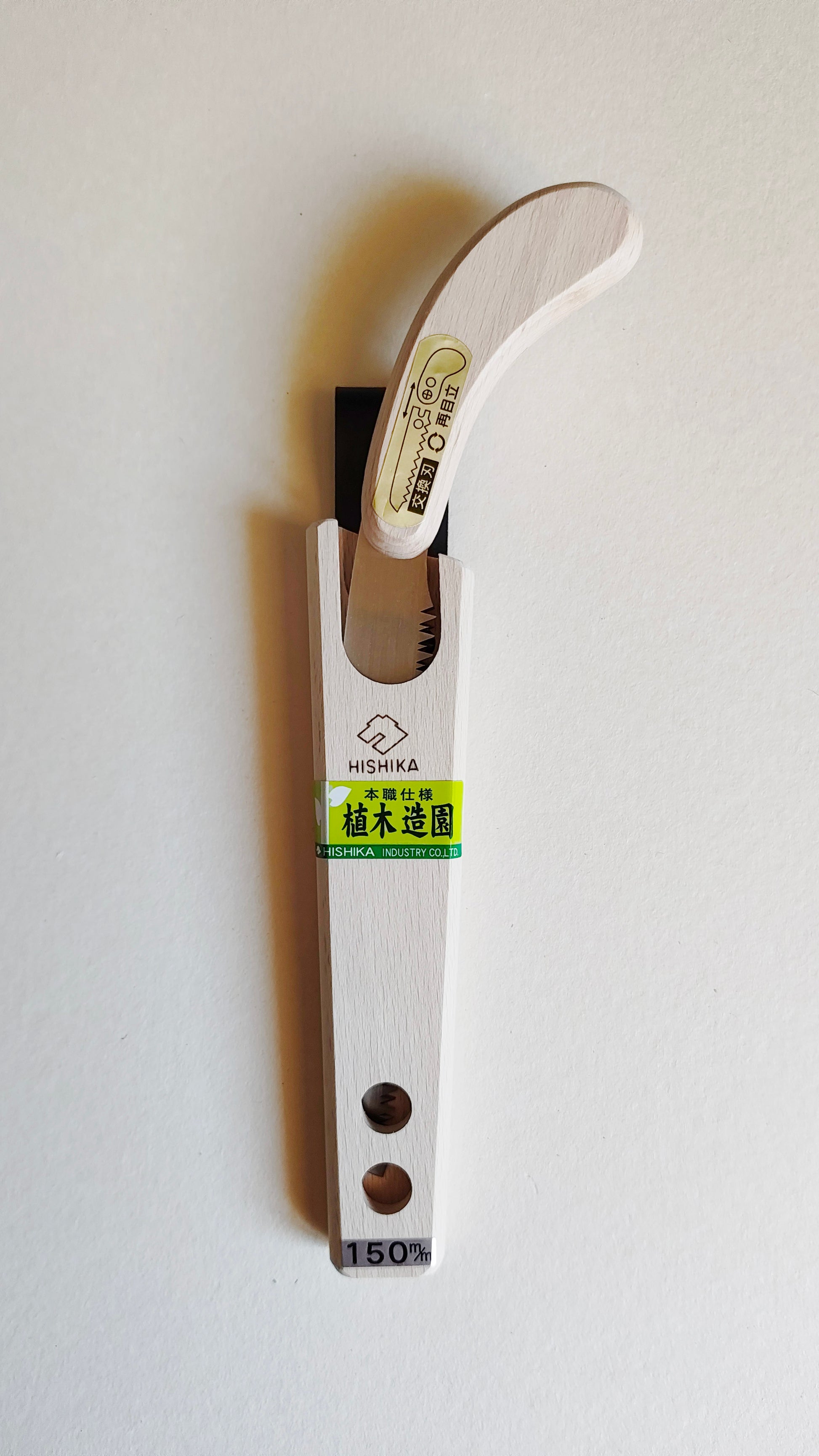 Cette petite scie d'élagage appelée "Kataba" à simple denture est conçue pour le jardinage et la taille des arbustes. Sa longueur de denture est de 150mm. Elle est extrêmement maniable, elle mesure 260mm de long. C'est une scie produite de manière semi-artisanale de la fameuse marque japonaise "Hishika". La lame est durcie par trempe à la main. Hishika est basée dans la ville de Miki célèbre pour sa production d'outils.