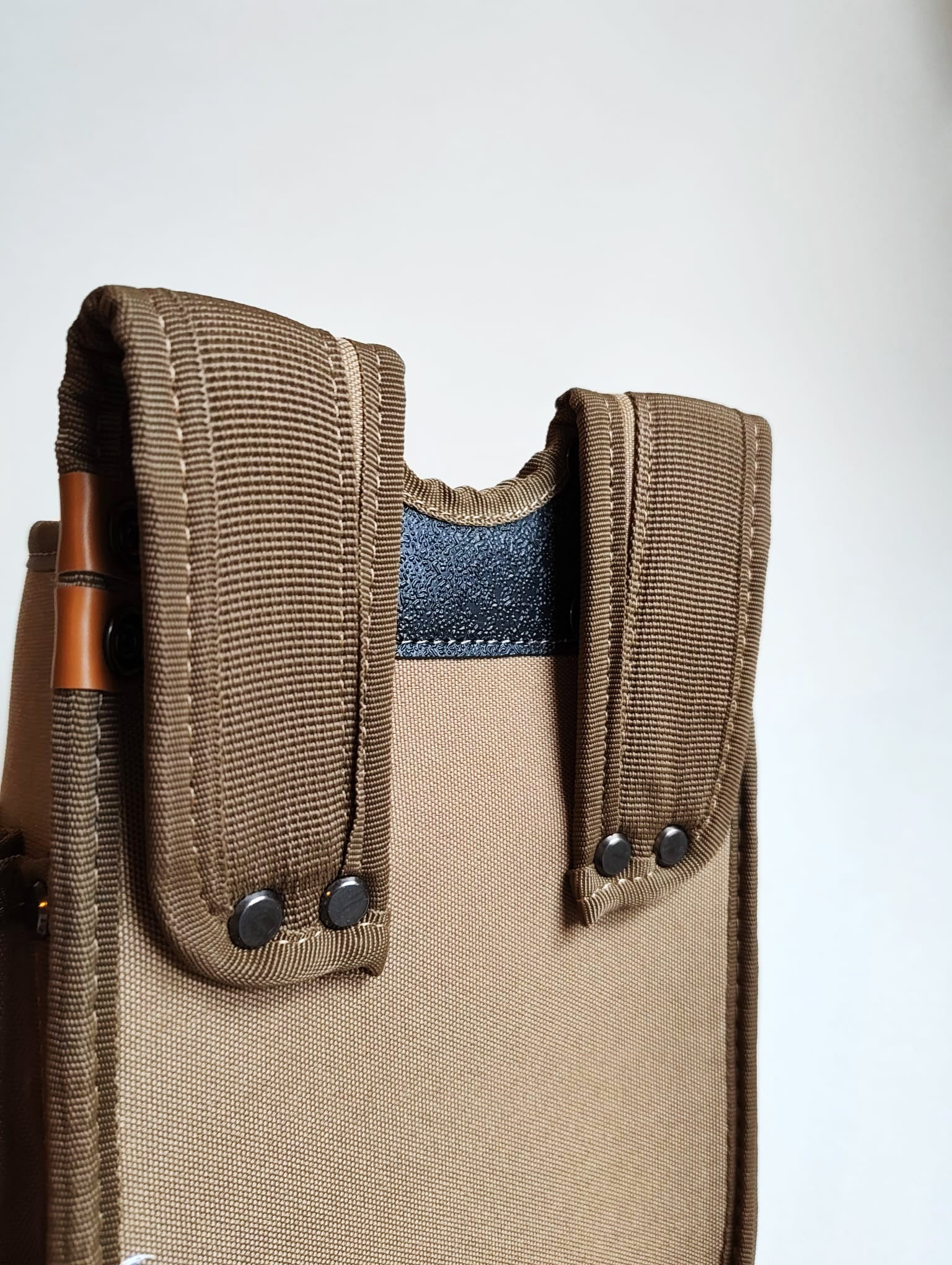 Ce sac est conçu au Japon par la firme Kozuchi qui est leader dans les accessoires de travail. Le sac est renforcé par une lame de plastique en ABS. Toutes les surpiqures sont épaisses et le biais qui recouvre les angles du sac est également trés robuste.