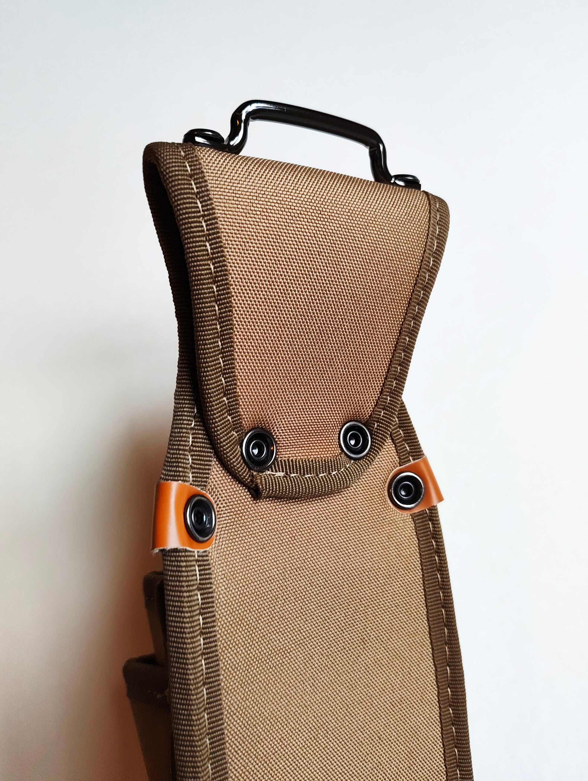 Ce sac est conçu au Japon par la firme Kozuchi qui est leader dans les accessoires de travail. Le sac est renforcé par une lame de plastique en ABS. Toutes les surpiqures sont épaisses et le biais qui recouvre les angles du sac est également trés robuste.