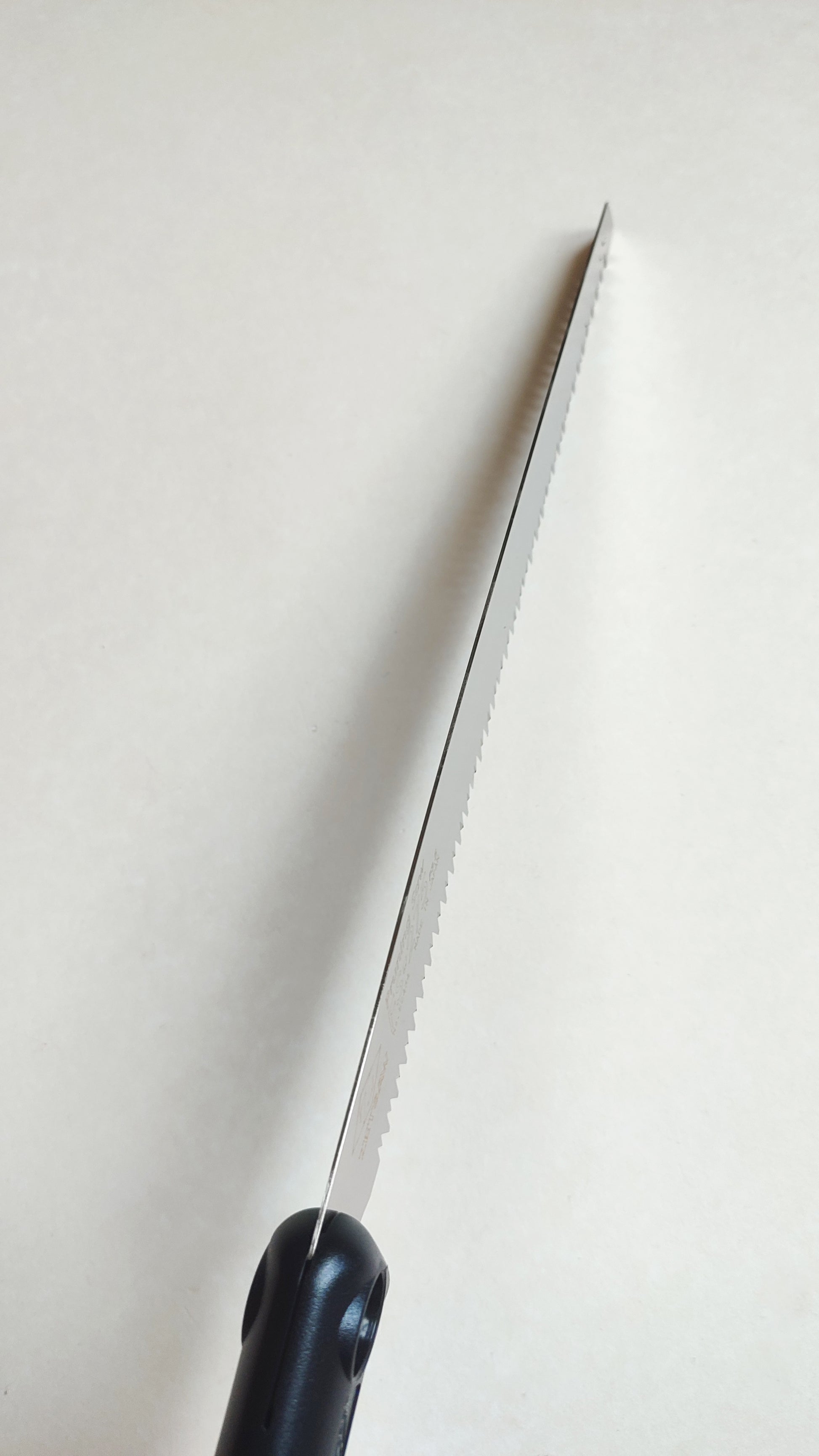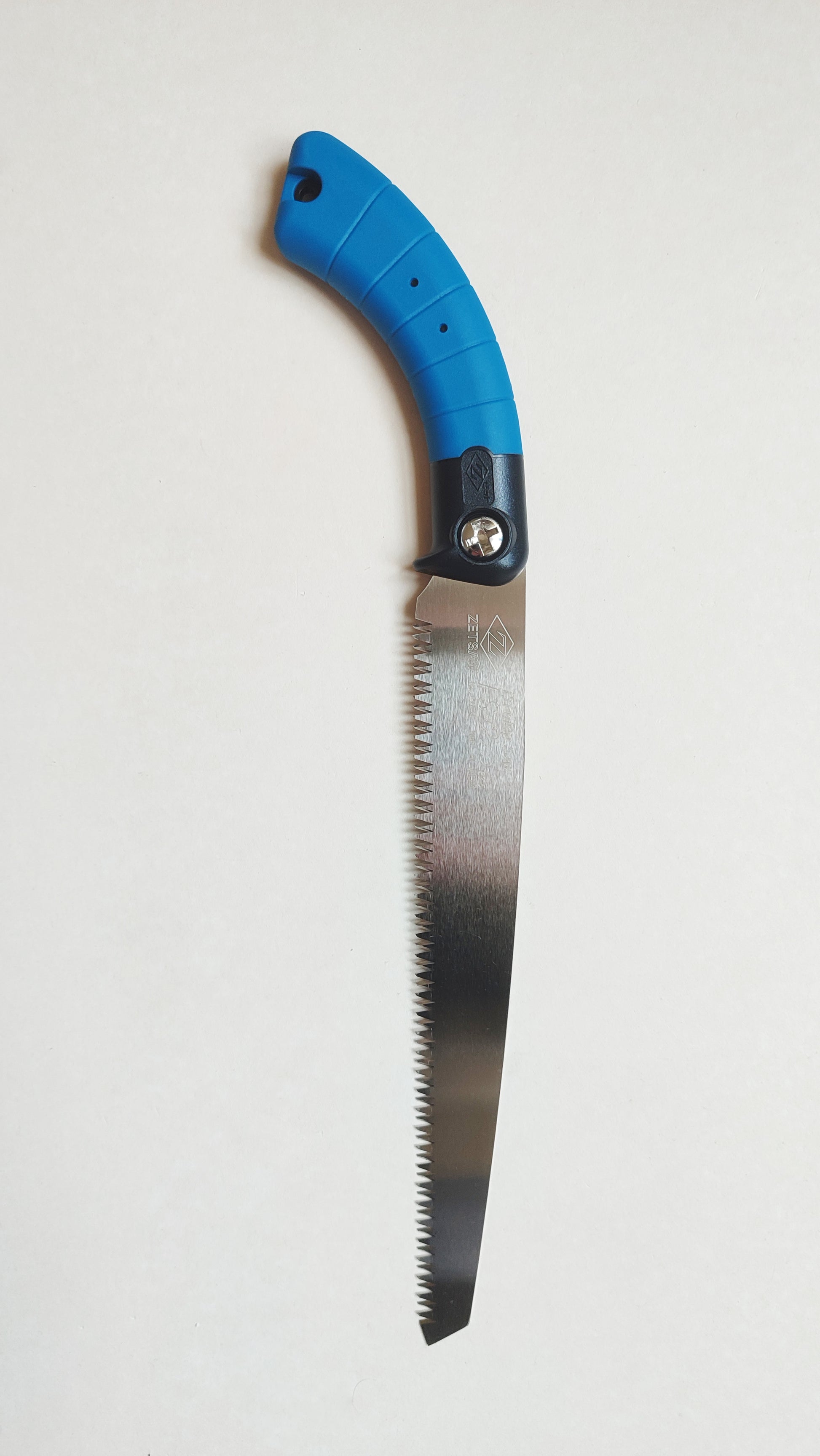 Son manche a un soft-grip et sa lame est interchangeable. Elle est fournie avec son fourreau équiper d'une attache ceinture inclinable. Elle est trés agressive. C'est une bonne scie pour découvrir l'usage des scies japonaises qui sont plus fines que les scies européennes. Il faut utiliser ce type de scie de manière précautionneuse de façon à ne pas faire trop courbe et sans faire trop d'à-coup.