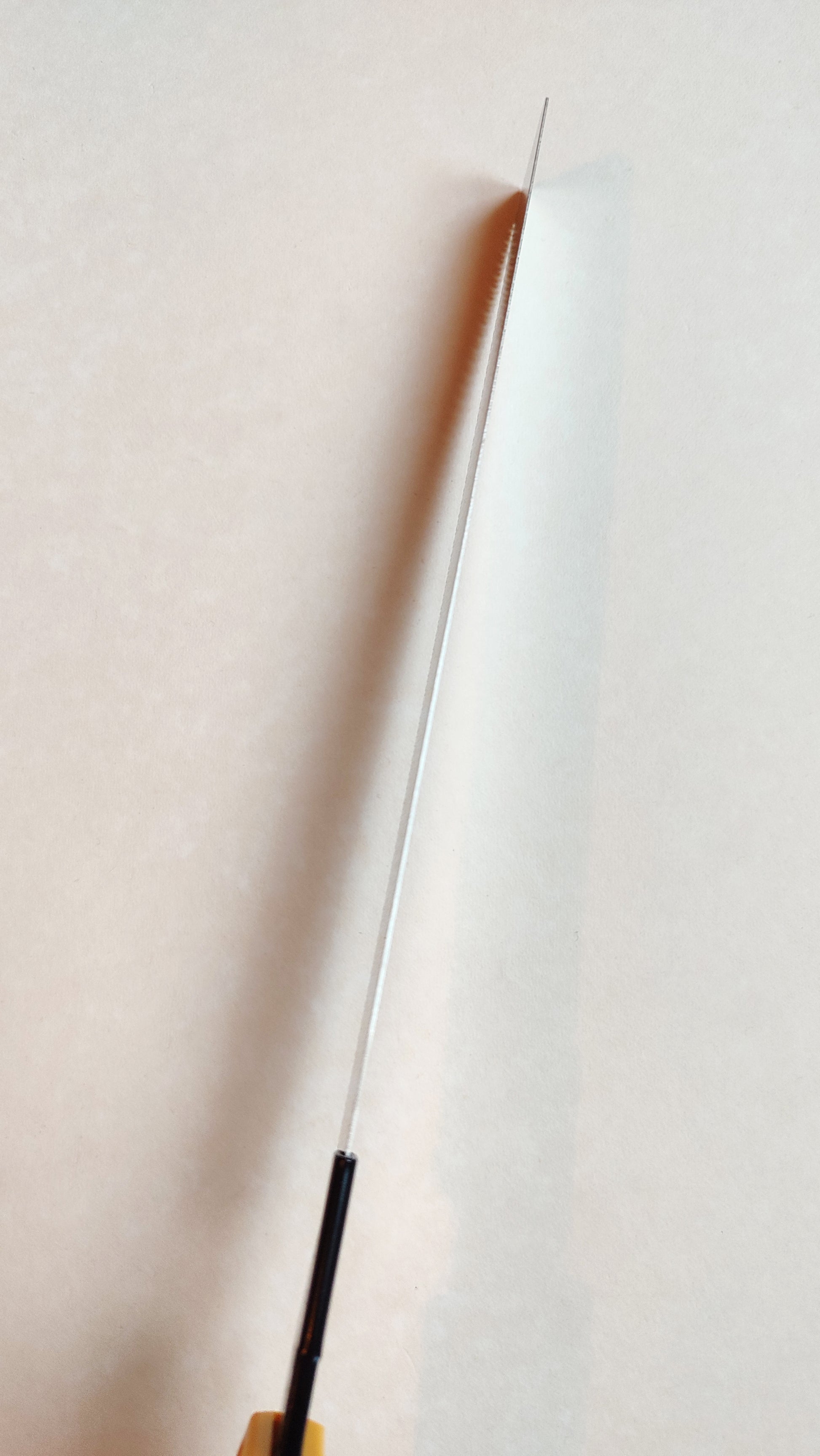 Sa longueur de lame est de 225mm, son épaisseur de 0,6mm. Elle a une denture qui travaillera en travers du fil du bois. C'est une scie trés polyvalente qui coupera aussi bien le massif que les contreplaqués,ainsi que certains plastiques.